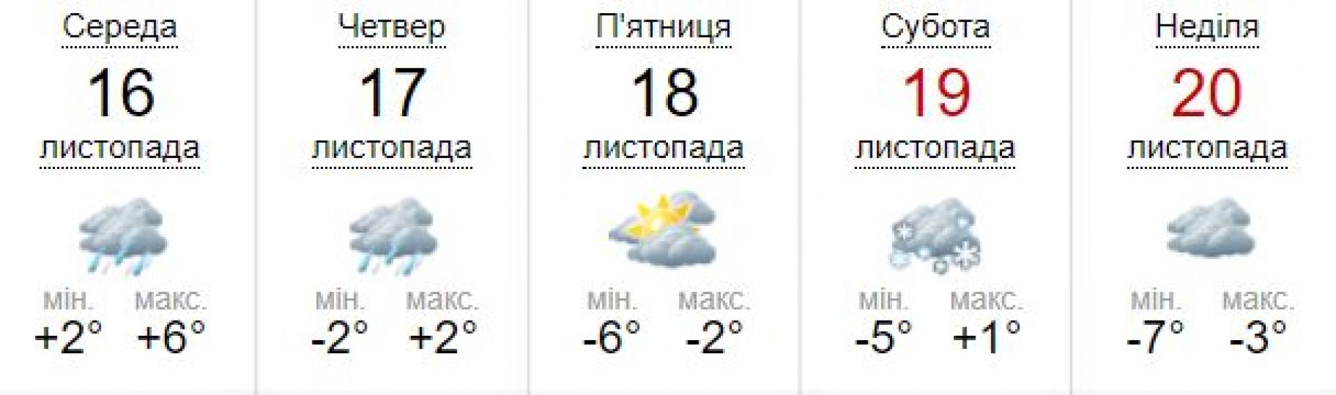- 18 листопада: без істотних опадів. Температура вночі 2-7° морозу, вдень від 1° тепла до 4° морозу.