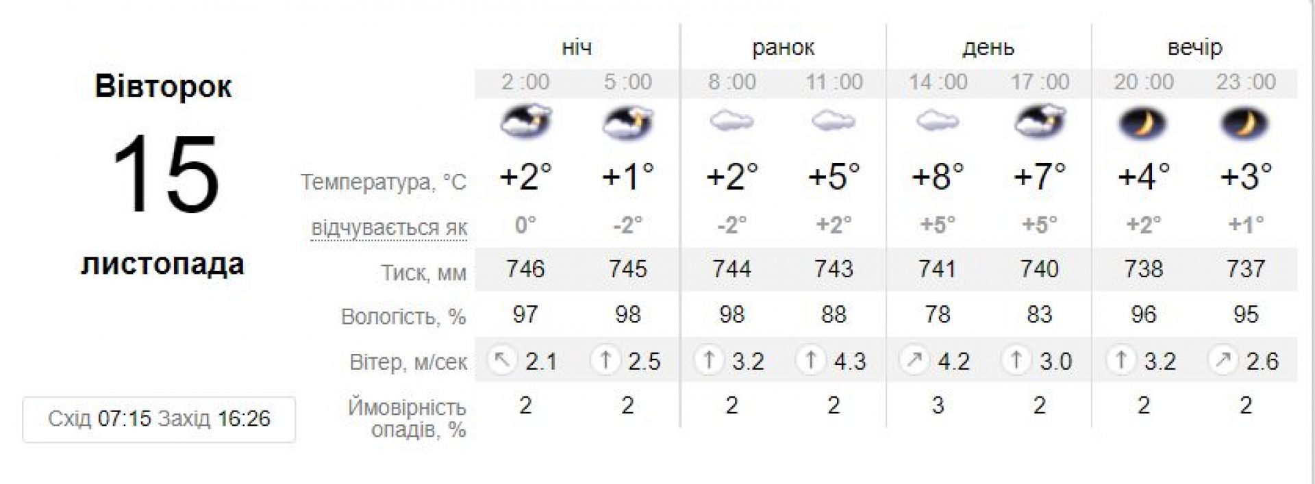 - 15 листопада: без опадів, хмарно з проясненнями, тумани. Вітер 3-8 м/с. Температура вночі від 3° тепла до 2° морозу, вдень 5-10° тепла.