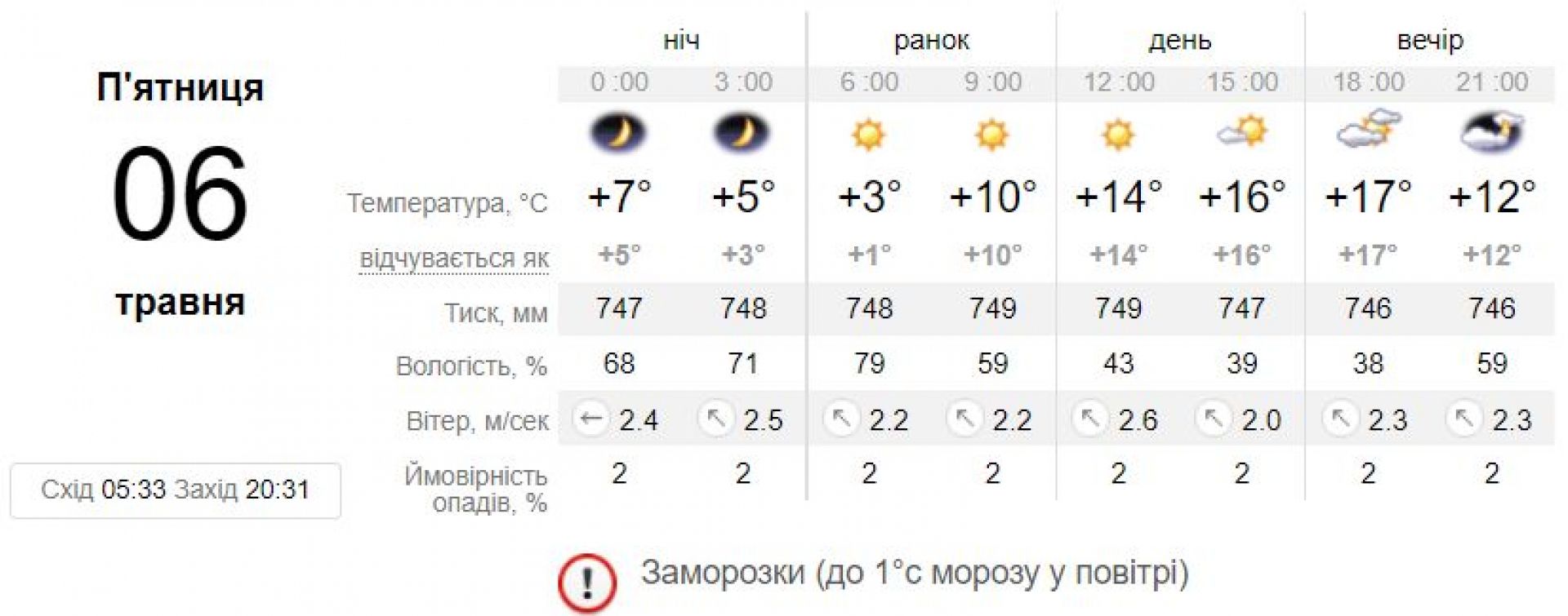 У Вінниці сайт sinoptik.ua прогнозує на 6 травня сонячну погоду та +3+17. Без опадів.