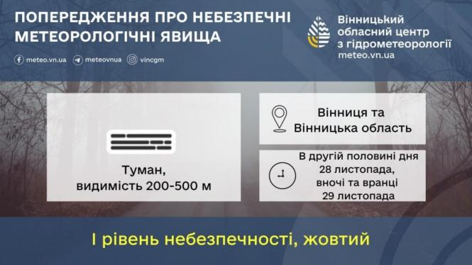 У другій половині дня 28 листопада, а також уночі та вранці 29 листопада очікується туман із видимістю 200–500 метрів. У неділю та понеділок тумани також можливі місцями. Синоптики закликають водіїв бути особливо уважними через погіршення видимості.