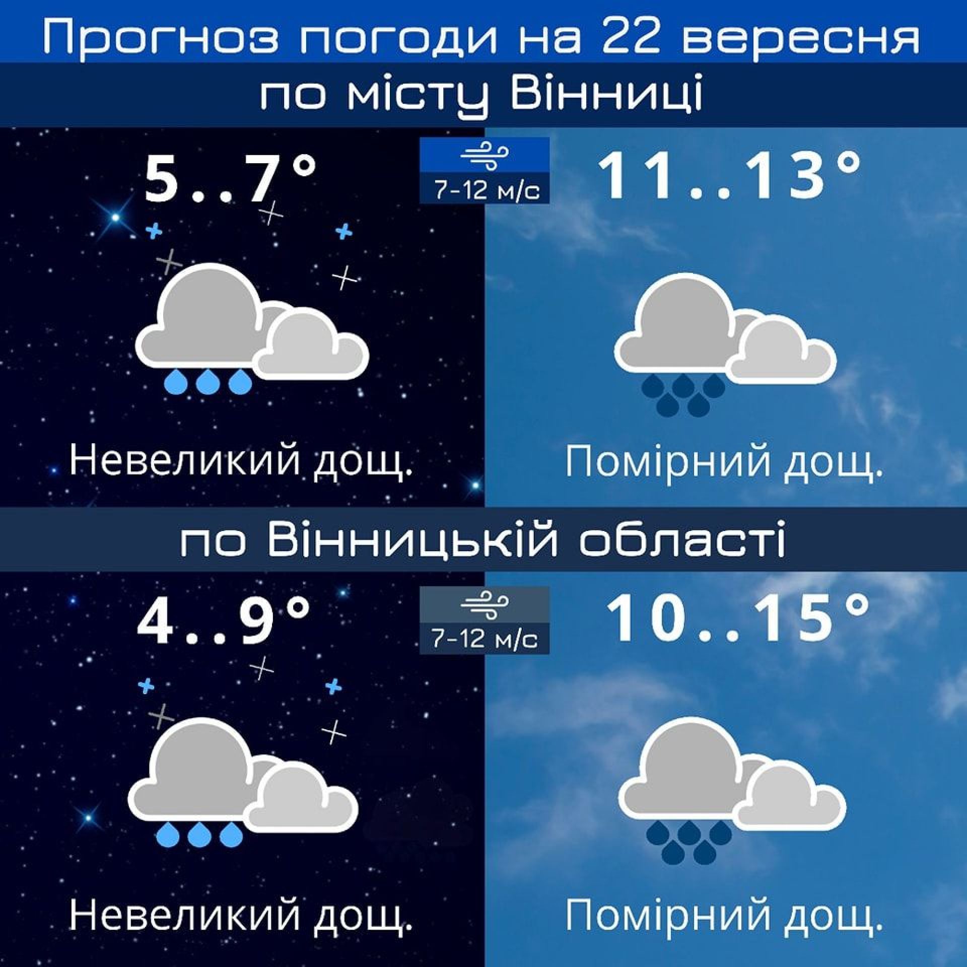 Також за їх прогнозом у Вінниці 22 вересня буде хмарно та йтиме помірний дощ. Вітер буде 7-12 м/с. Температура вдень 11-13° тепла.