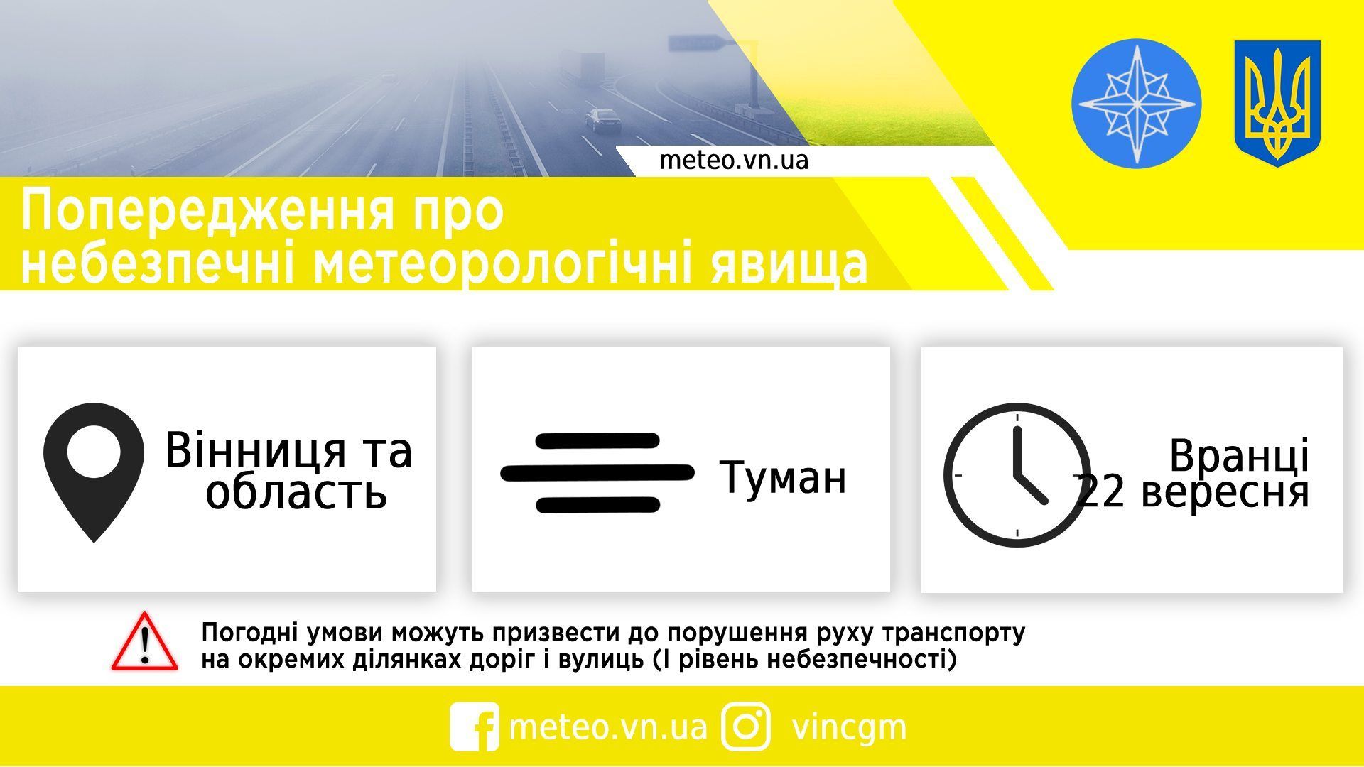 — Вранці 22 вересня по Вінницькій області та м. Вінниця очікується туман видимість 200-500 м (перший рівень небезпечності, жовтий), — зазначають у повідомленні.