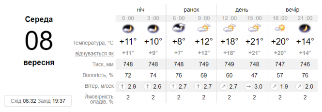 Сайт sinoptik.ua у Вінниці на 8 вересня прогнозує хмарну з проясненнями погоду без опадів та +21 вдень.