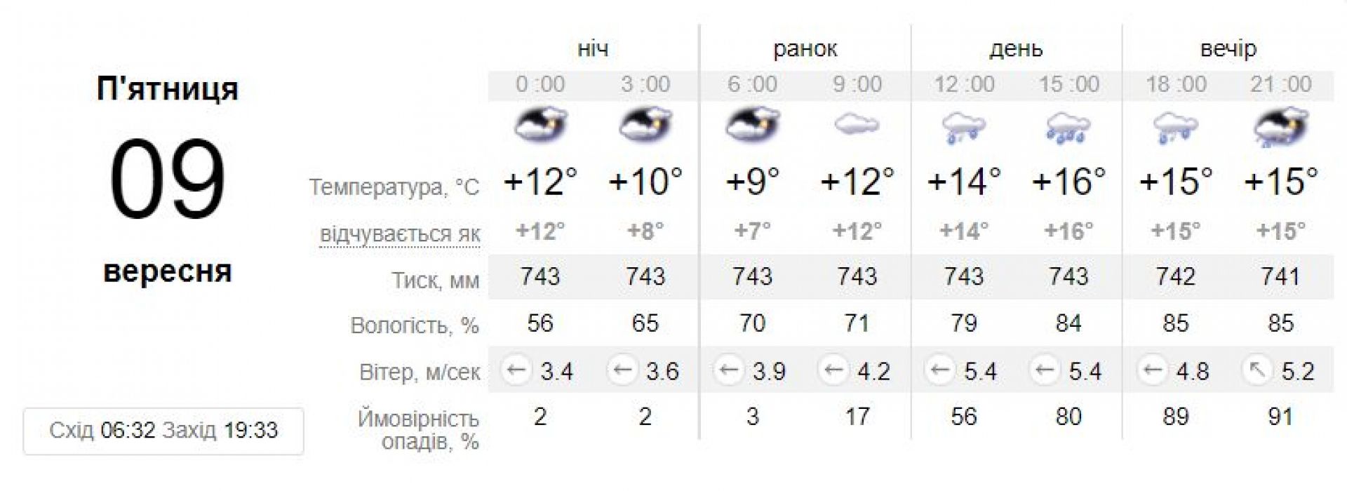 У Вінниці сайт sinoptik.ua на 9 вересня прогнозує харний день та +9+15 градусів. Опади розпочнуться орієнтовно з 12 години.