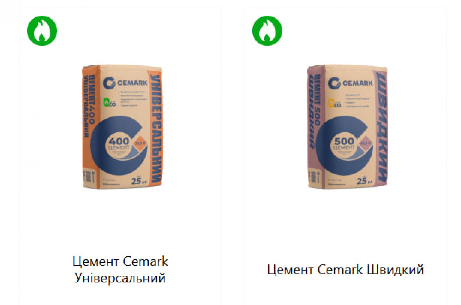 - Навальний і тарований (в 25- і 50-кілограмових мішках) цемент, зокрема для бетонування в холодну пору року, марок: