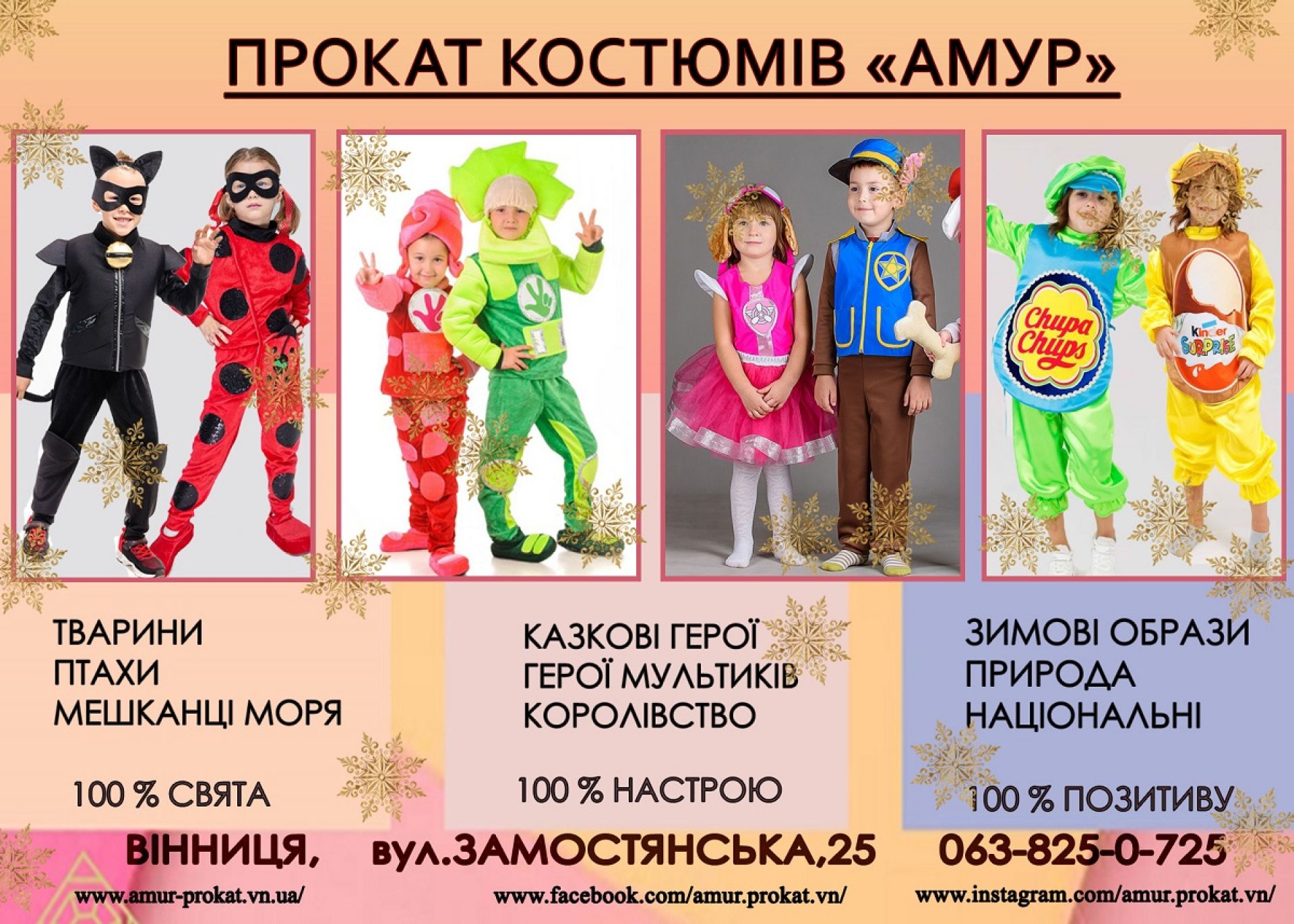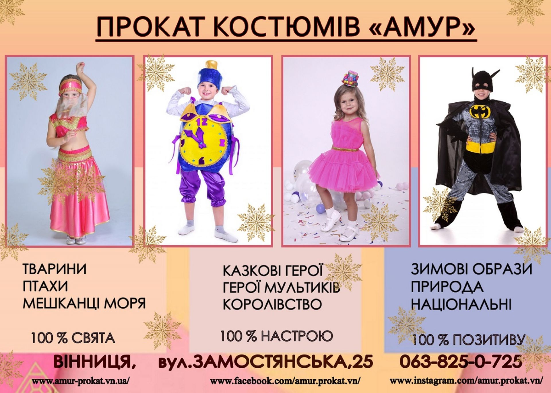 Список костюмів постійно доповнюється. Якщо Ви не знайшли потрібного Вам героя на сайті amur-prokat.vn.ua – телефонуйте 063 825 07 25 та приходьте на примірку за адресою вул. Замостянська, 25 навпроти РАЦСу (в грудні часи роботи змінюються, на вихідні працюємо також)