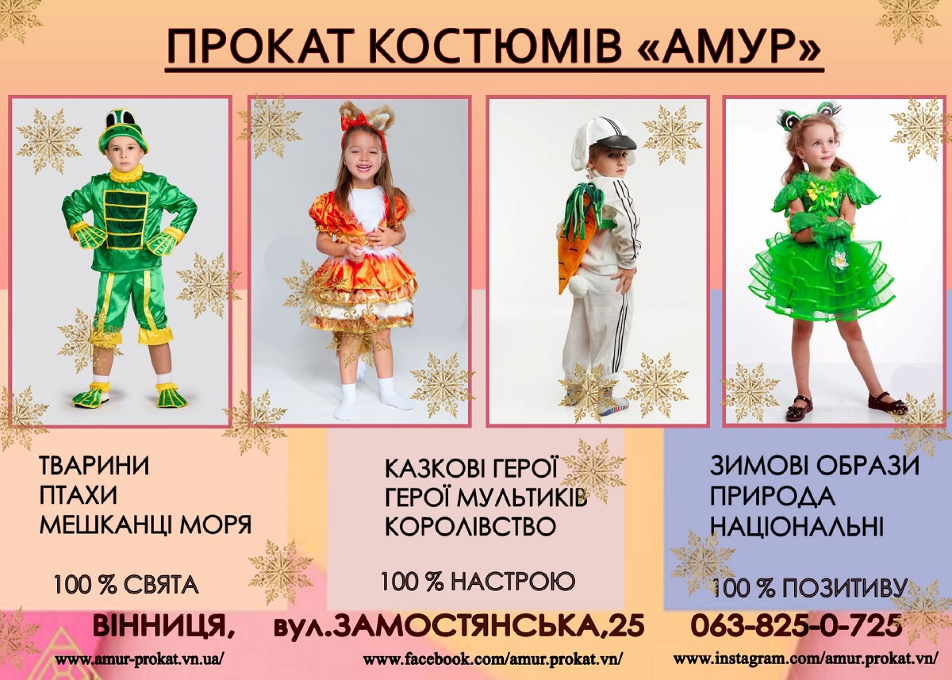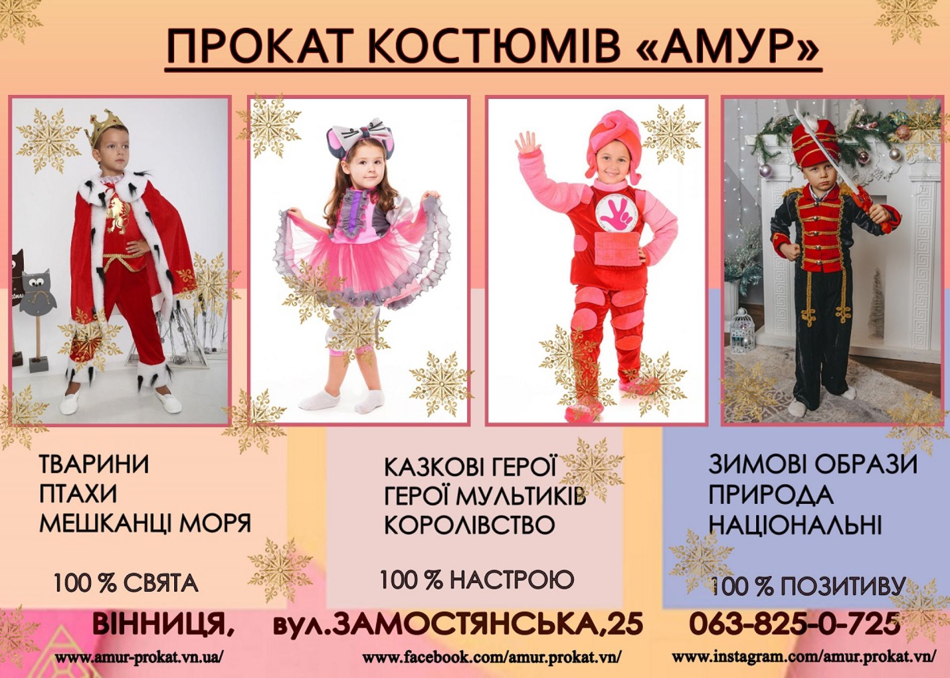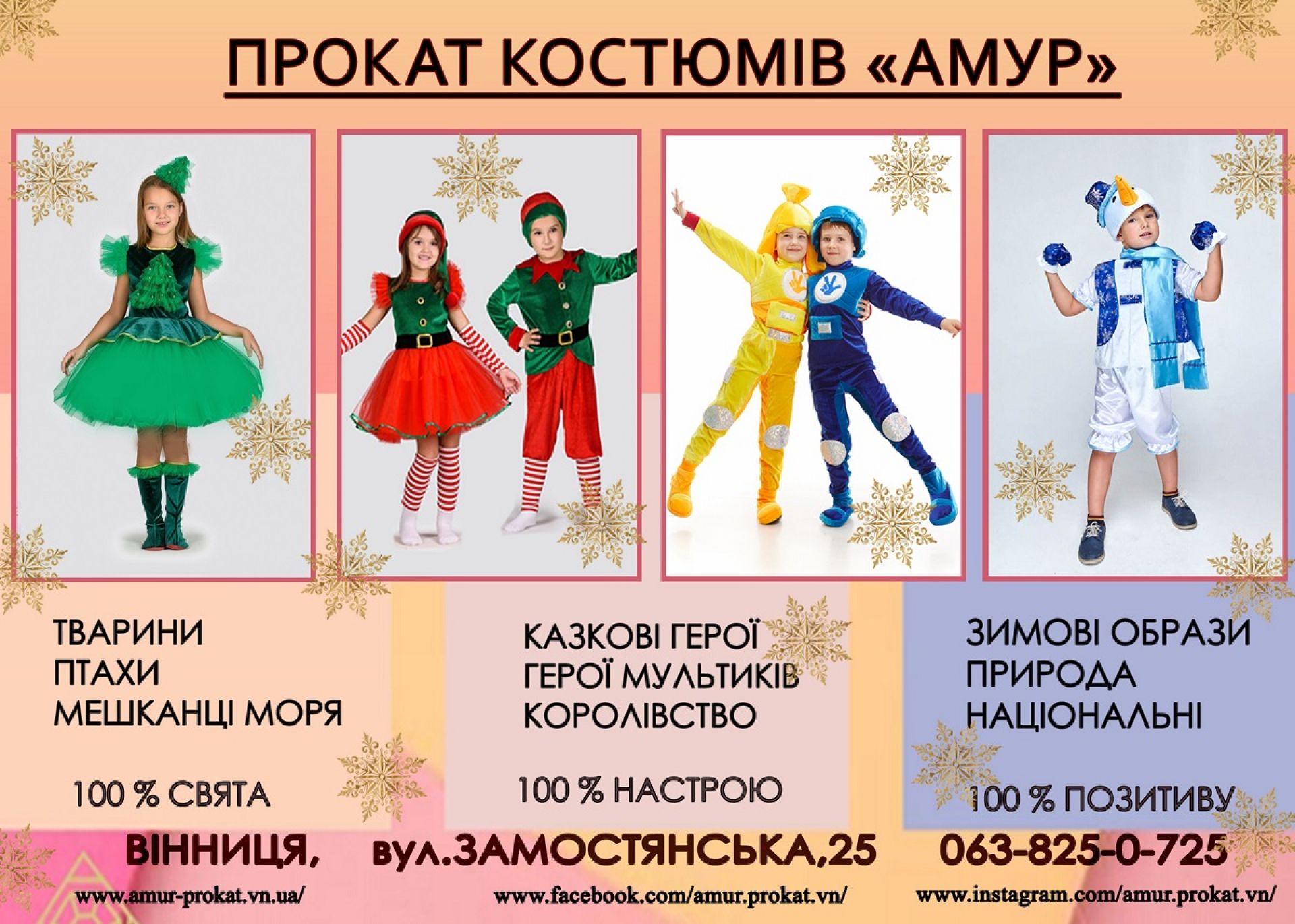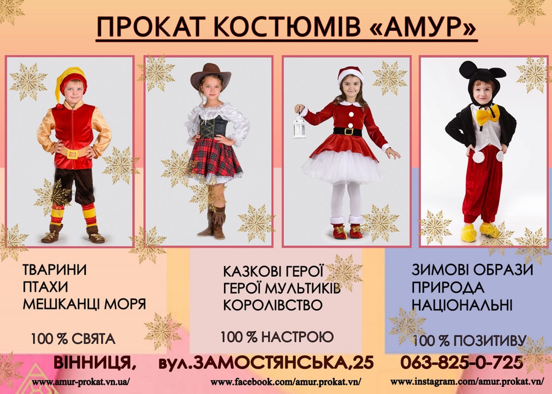 Прокат «Амур» пропонує великий вибір дитячих образів для новорічних ранків, свят у садочку та школі, а також зимових фотосесій. У наявності різноманітні костюми звичних та найдивовижніших персонажів в різних розмірах, кольорах, моделях і варіаціях. А для маленьких принцес маємо великий асортимент суконь стилізованих під тематичні образи за допомогою аксесуарів – обручів, корон, вушок та інших декоративних деталей.