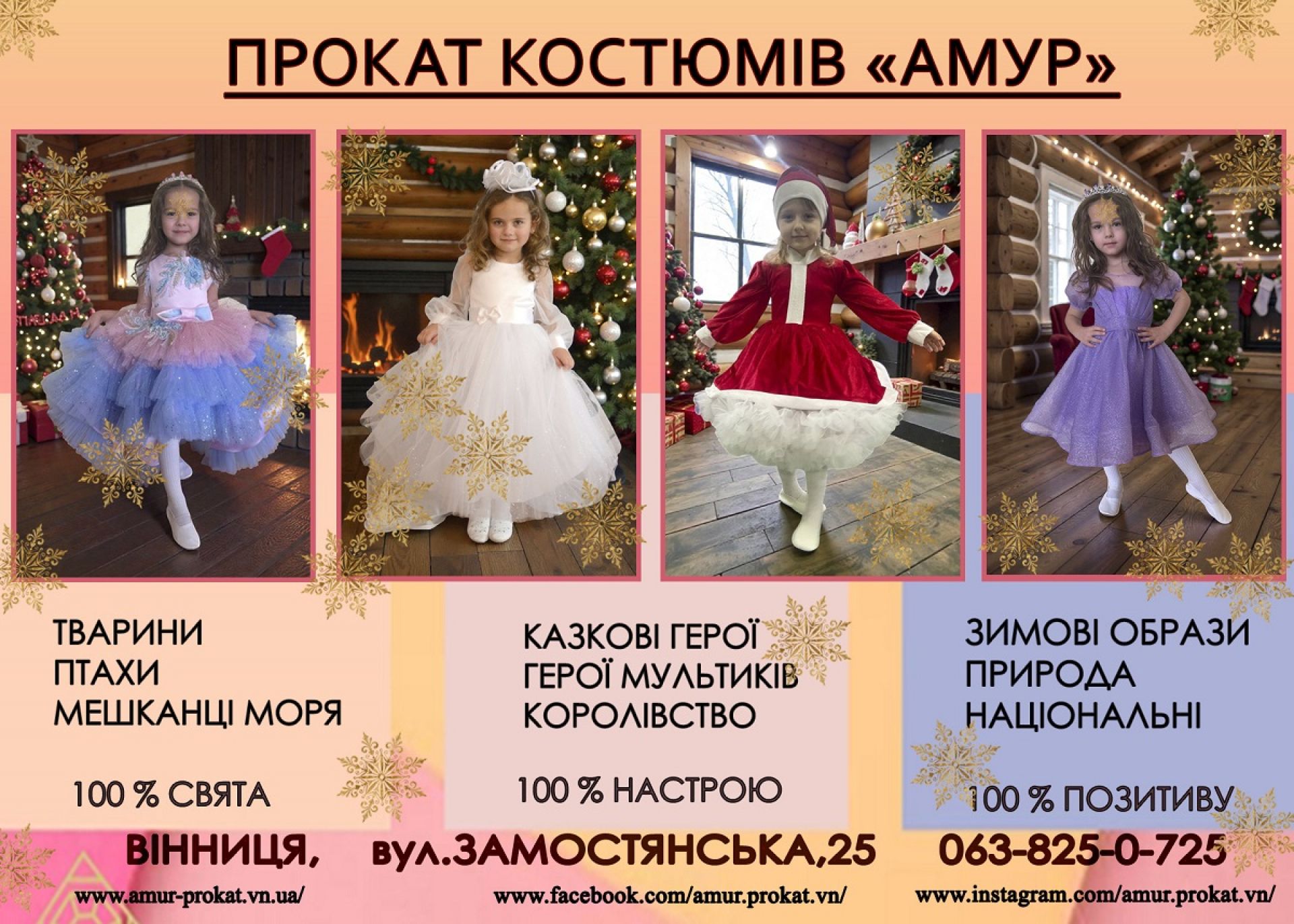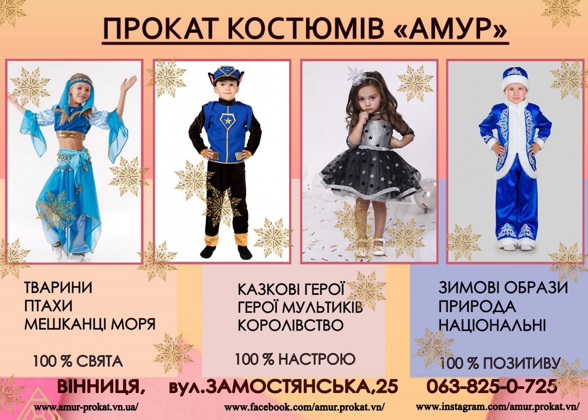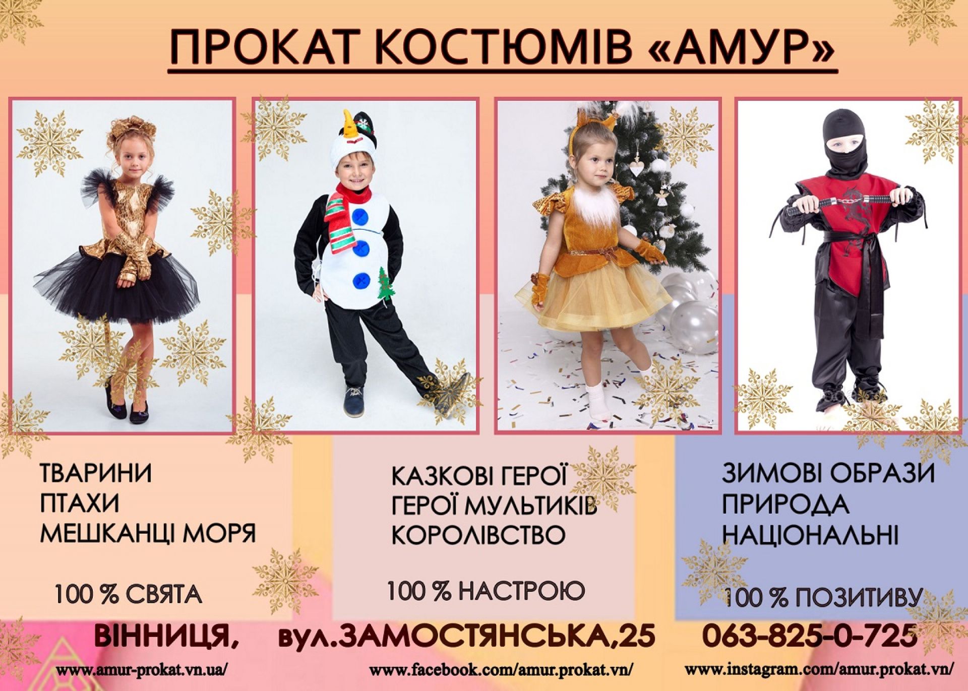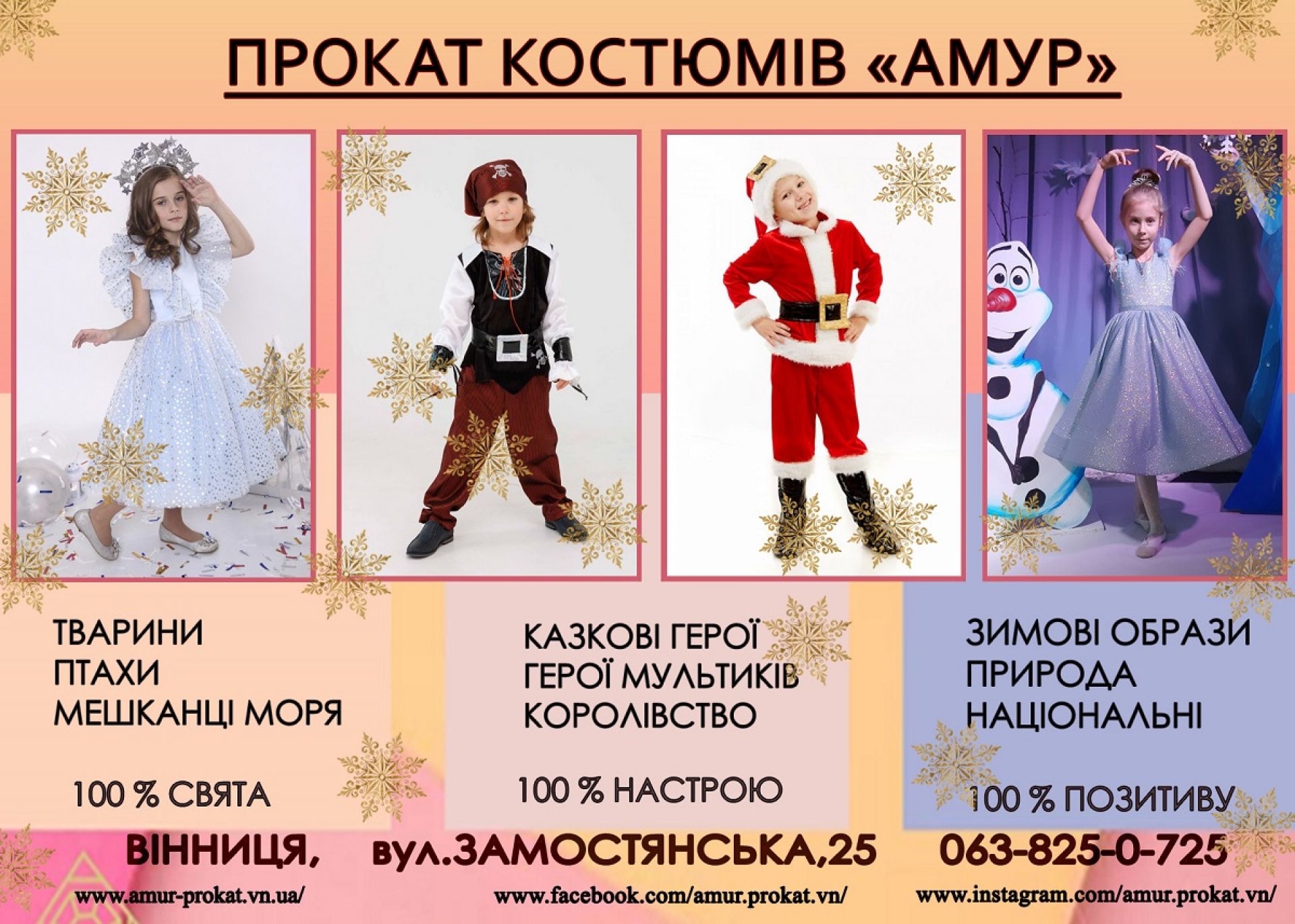 Прокат «Амур» пропонує великий вибір дитячих образів для новорічних ранків, свят у садочку та школі, а також зимових фотосесій. У наявності різноманітні костюми звичних та найдивовижніших персонажів в різних розмірах, кольорах, моделях і варіаціях. А для маленьких принцес маємо великий асортимент суконь стилізованих під тематичні образи за допомогою аксесуарів – обручів, корон, вушок та інших декоративних деталей.