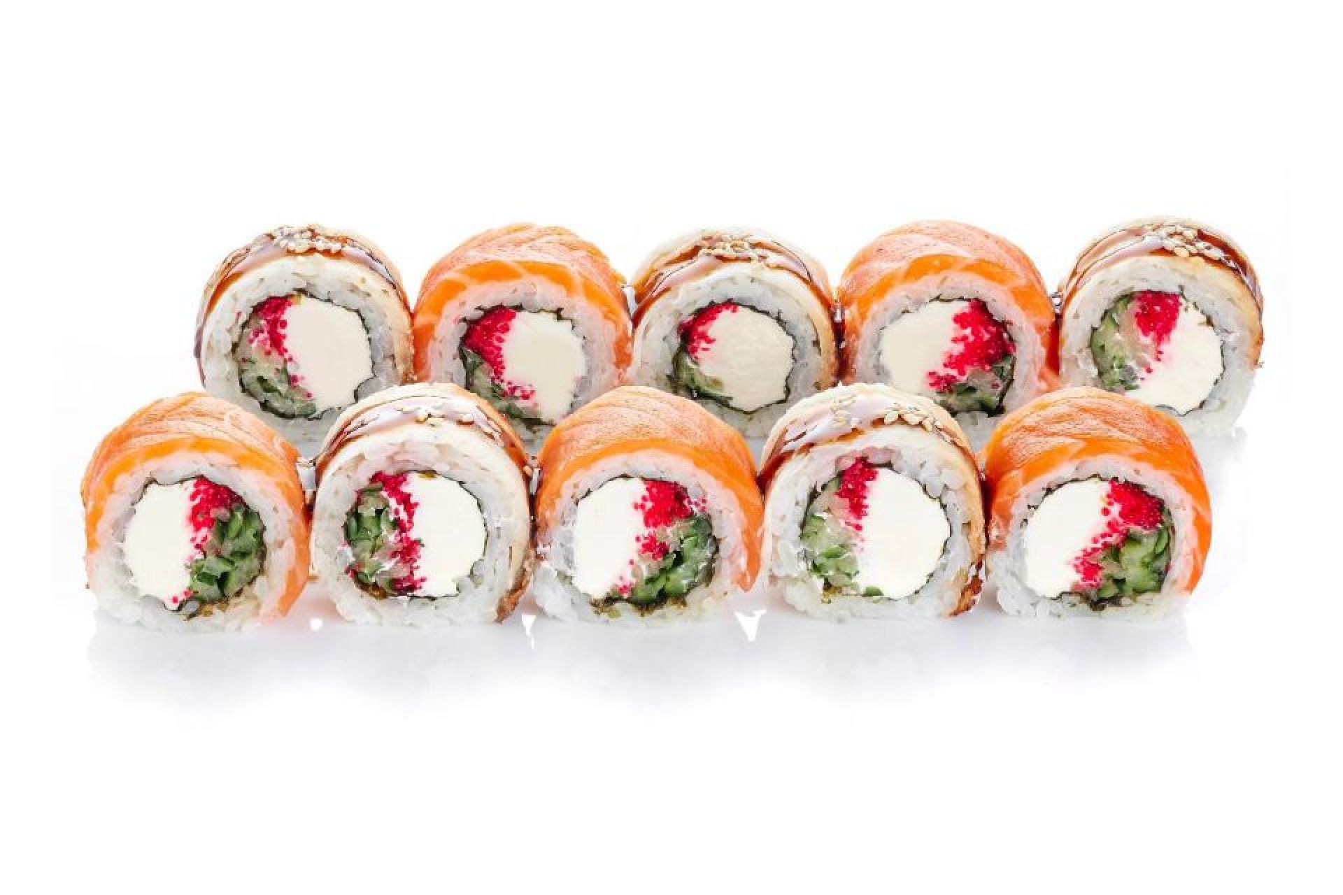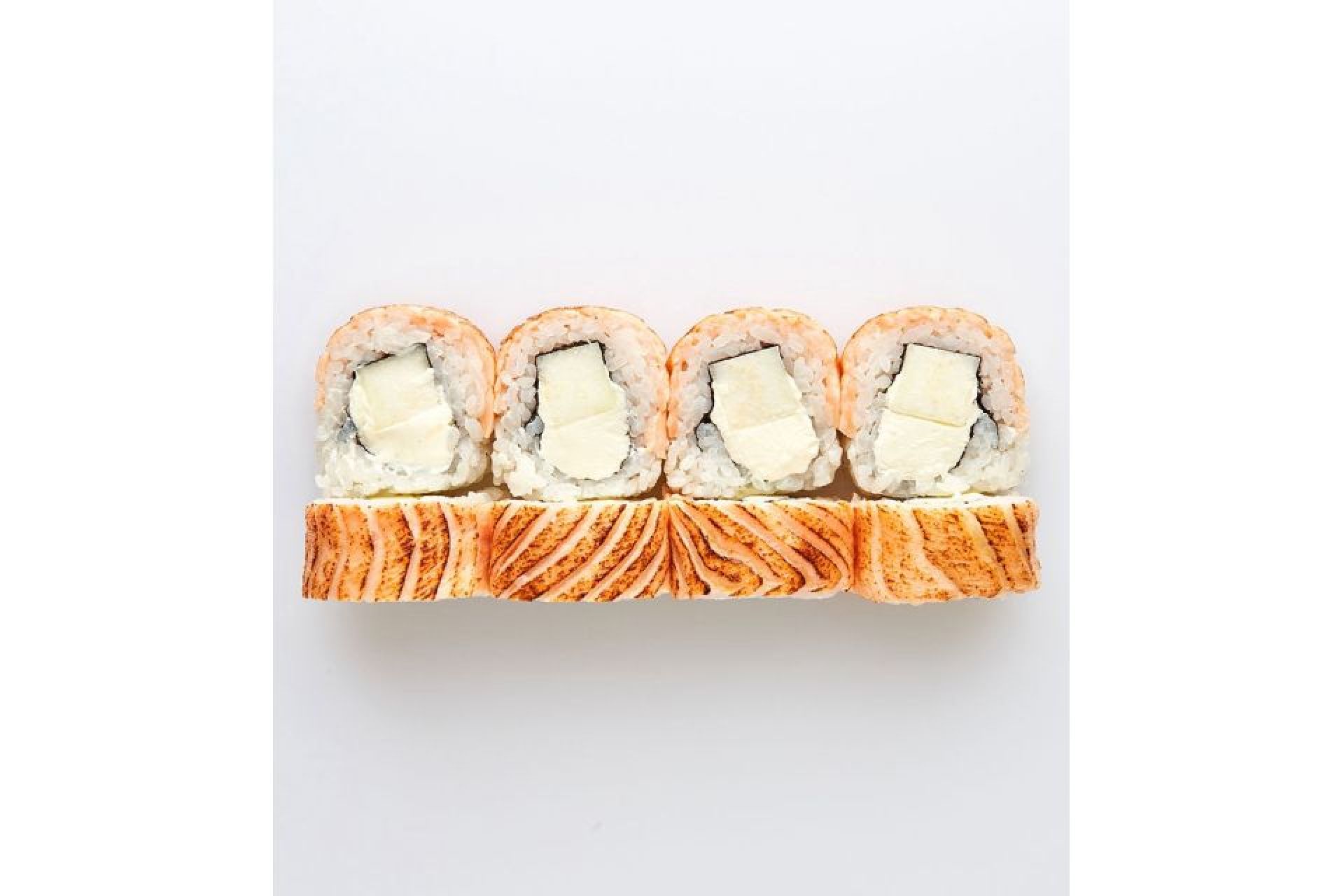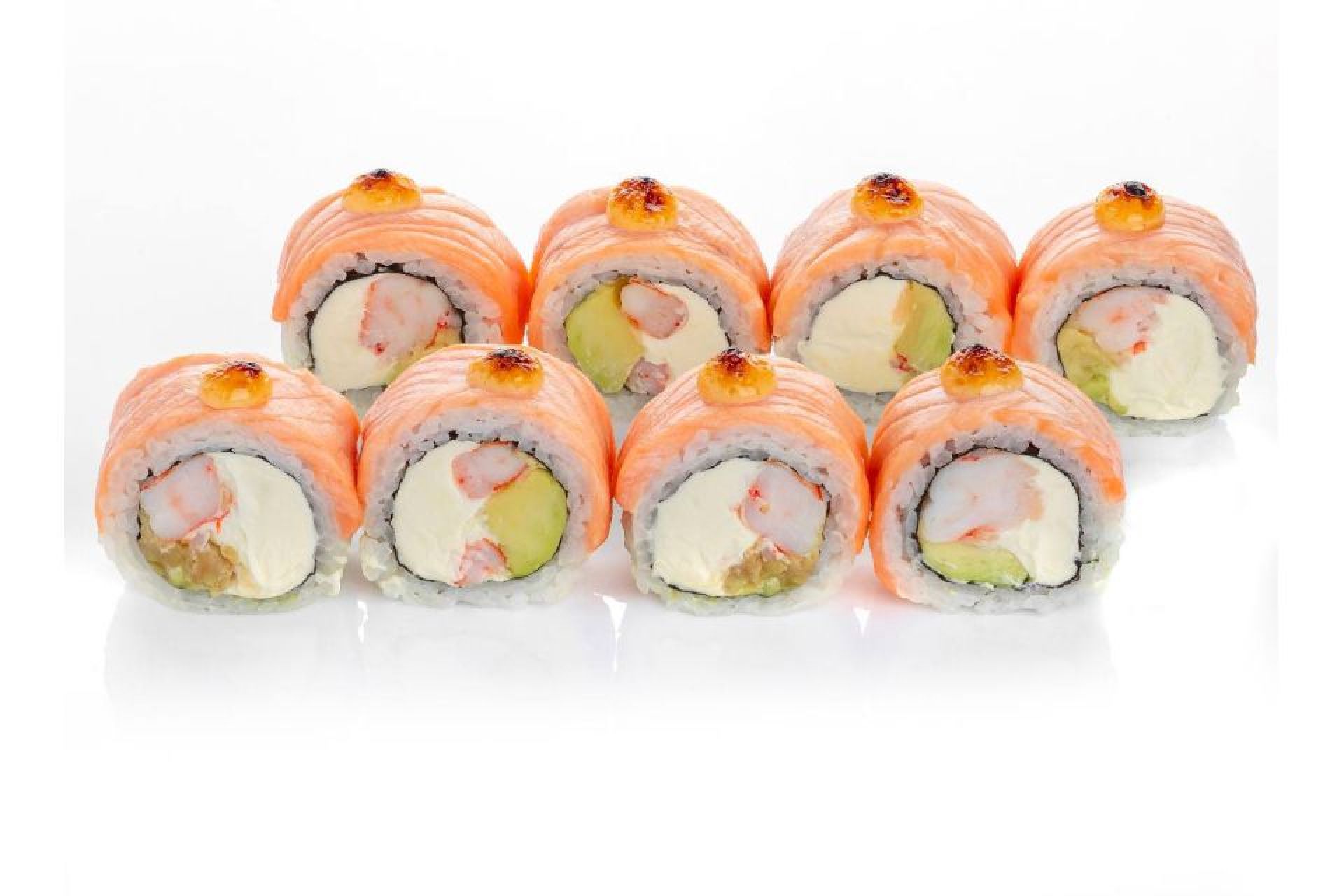 - Запечений рол із копченим лососем та сніжним крабом (філадельфія, сніжний краб, лосось х/к, огірок, ікра тобіко, кунжут, японський майонез, моцарела, рис)