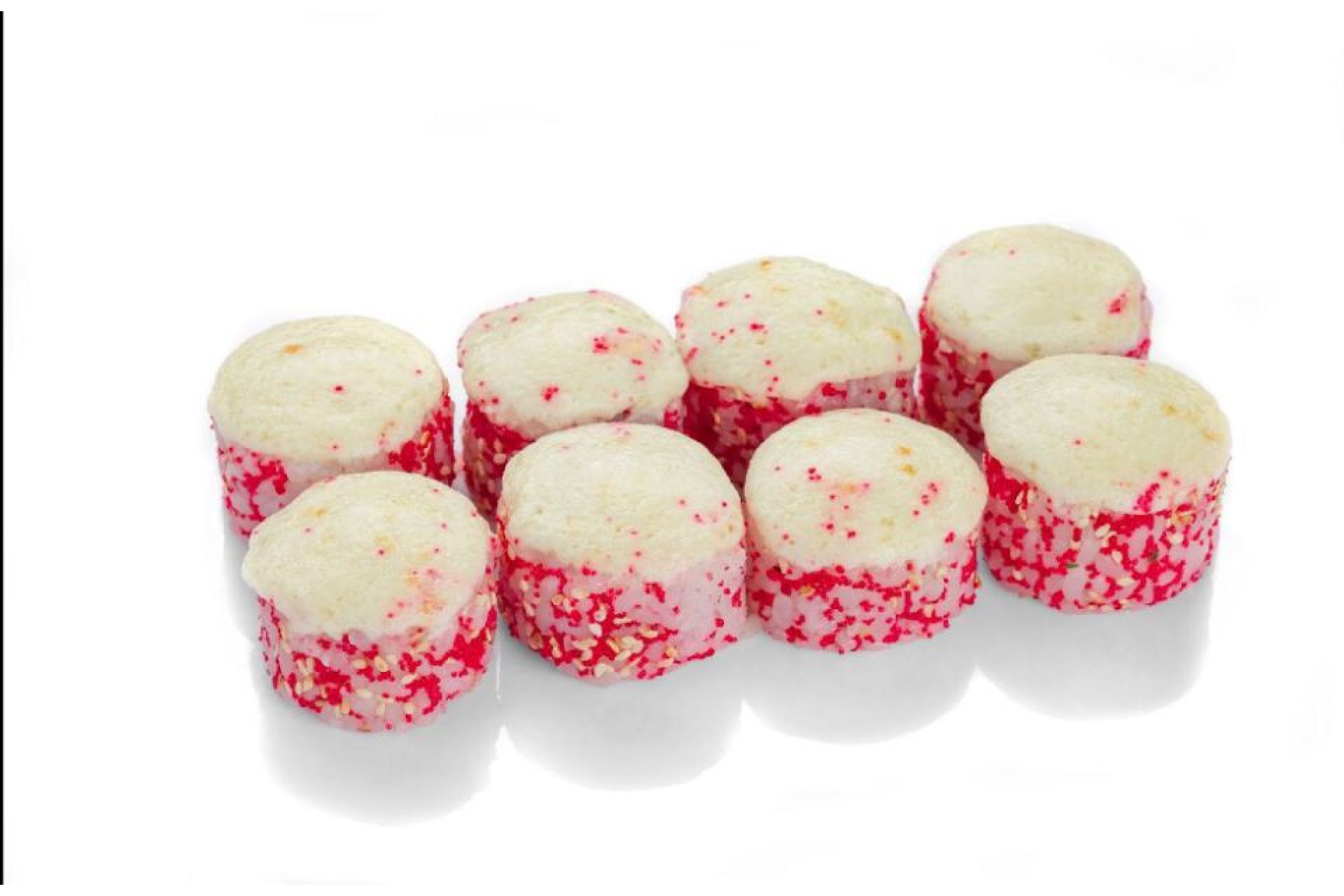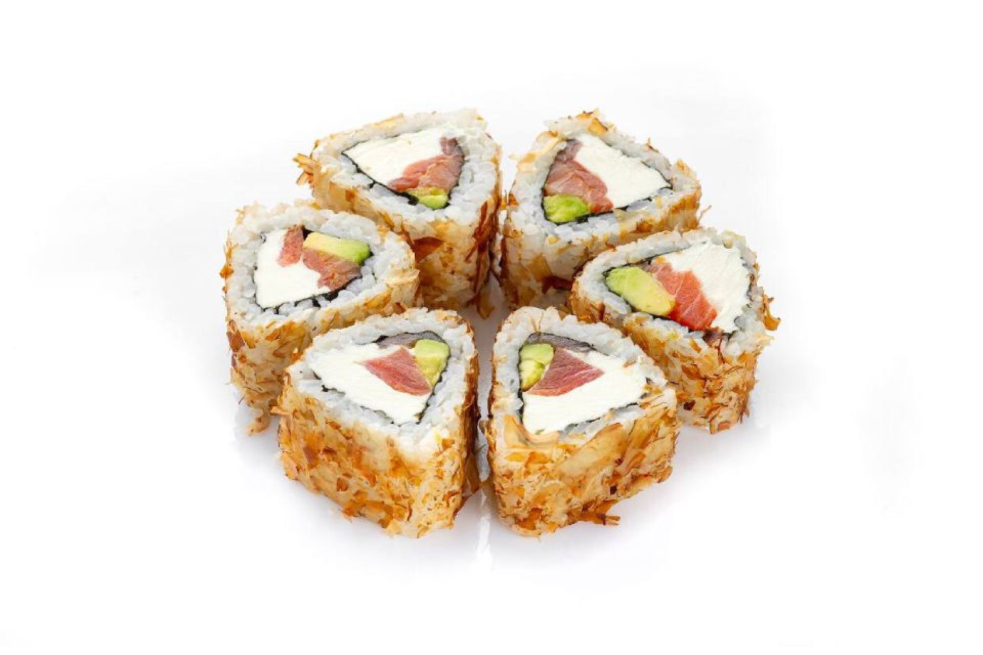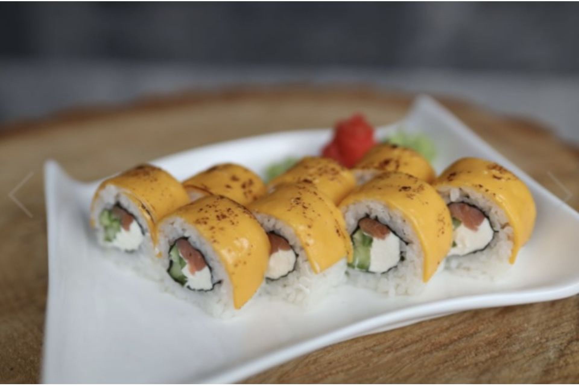 - Запечений рол із копченим лососем та сніжним крабом (філадельфія, сніжний краб, лосось х/к, огірок, ікра тобіко, кунжут, японський майонез, моцарела, рис)