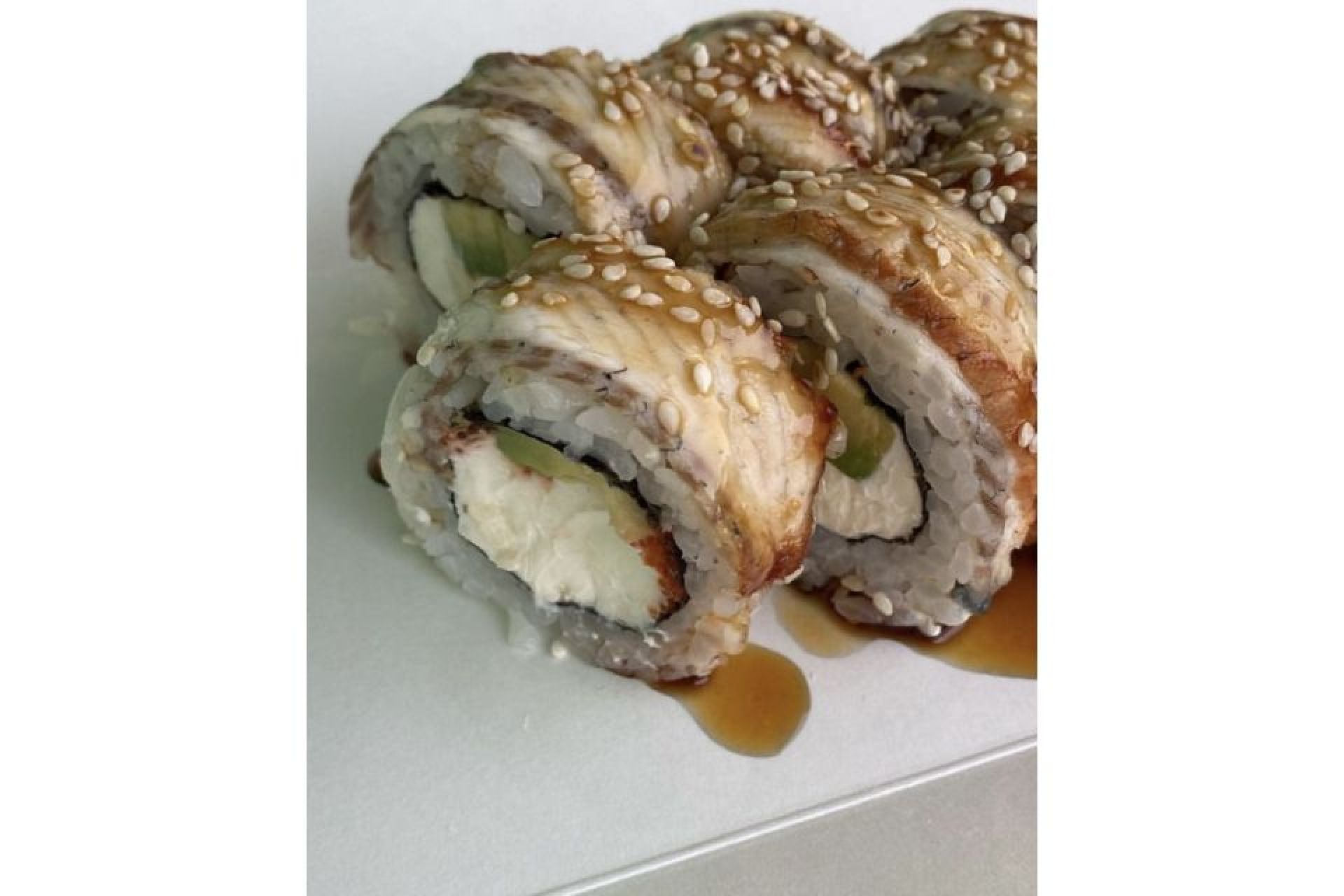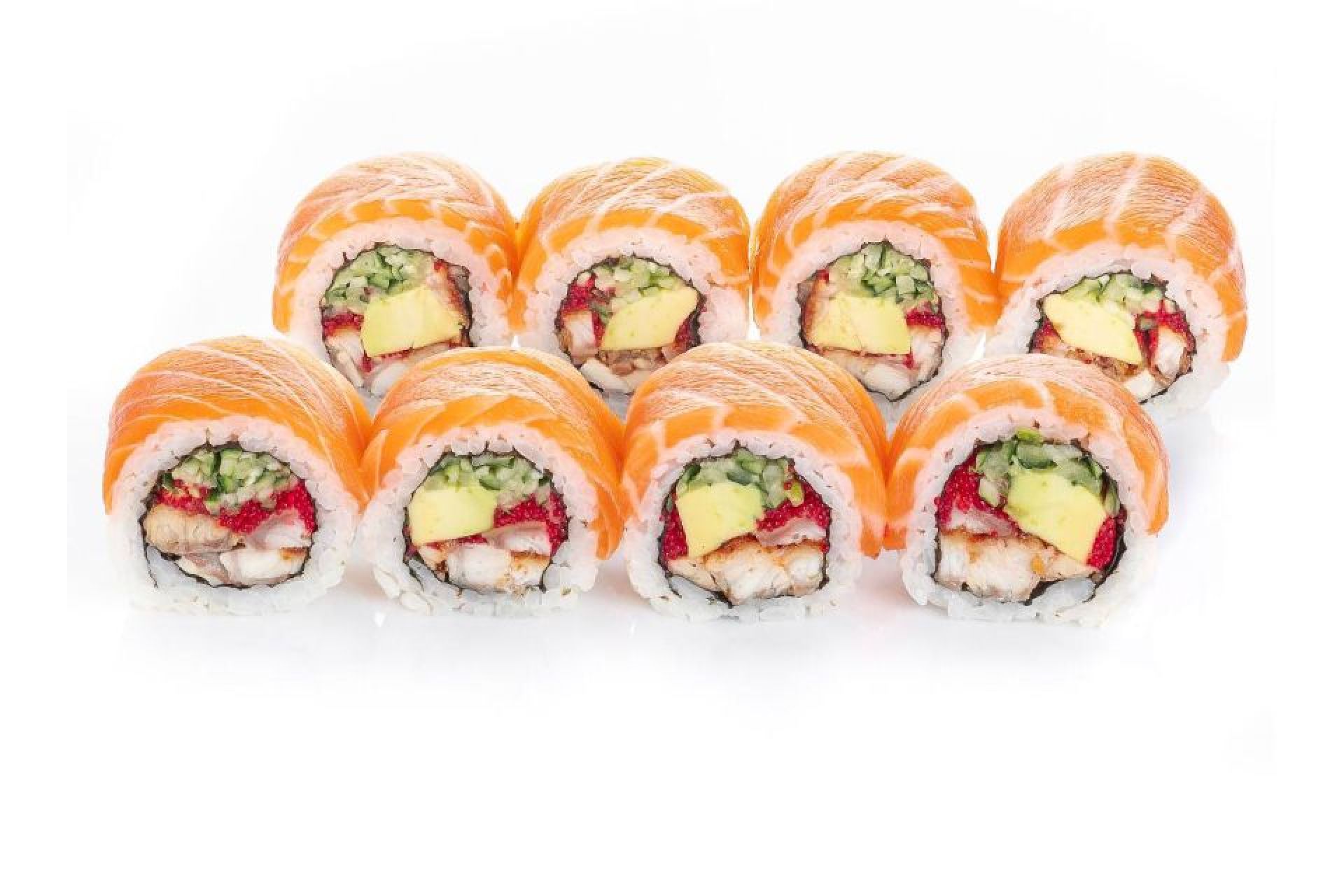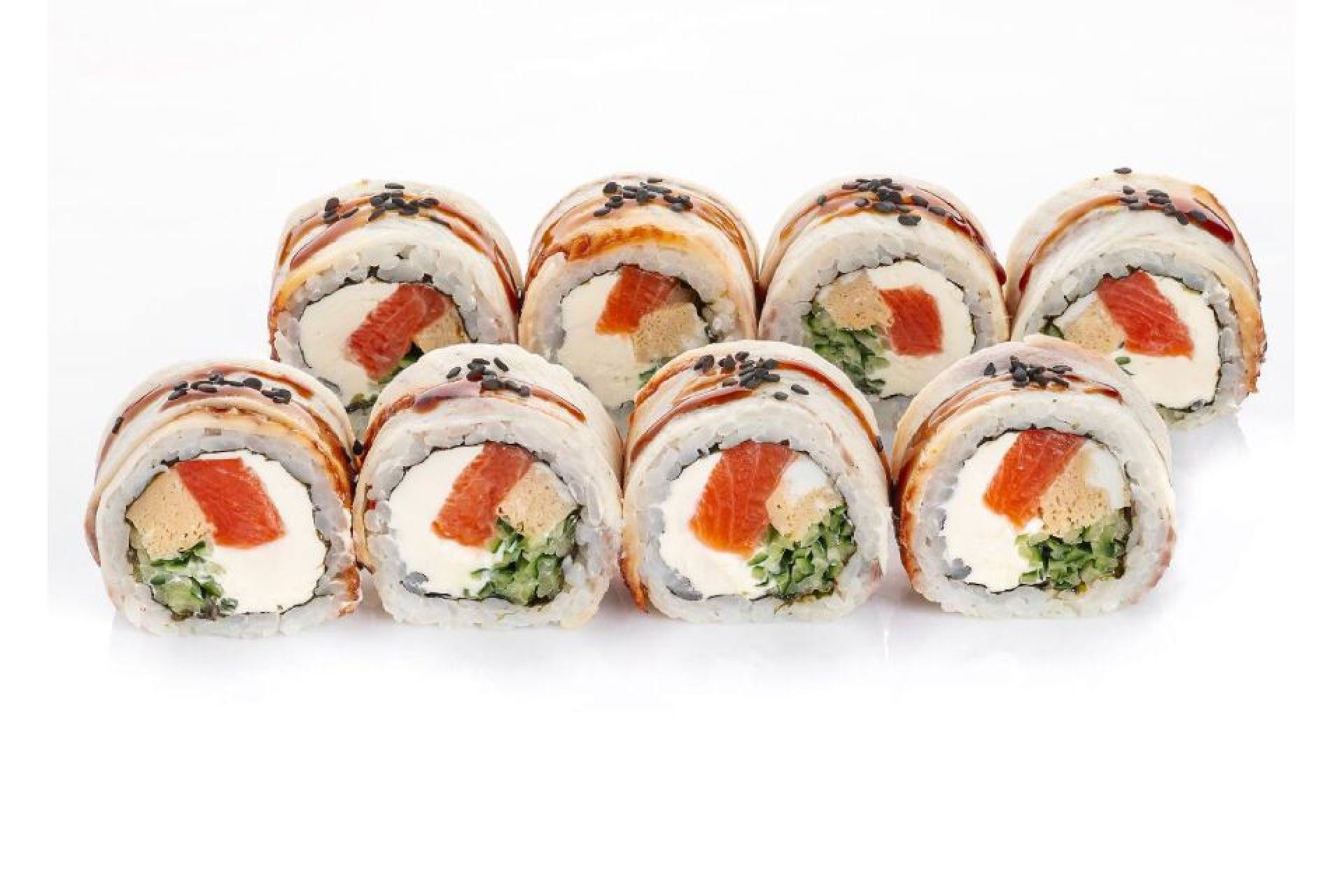 - Сяке унагі (лосось свіжий, вугор, філадельфія, огірок, ікра тобіко, соус унагі, кунжут, рис)