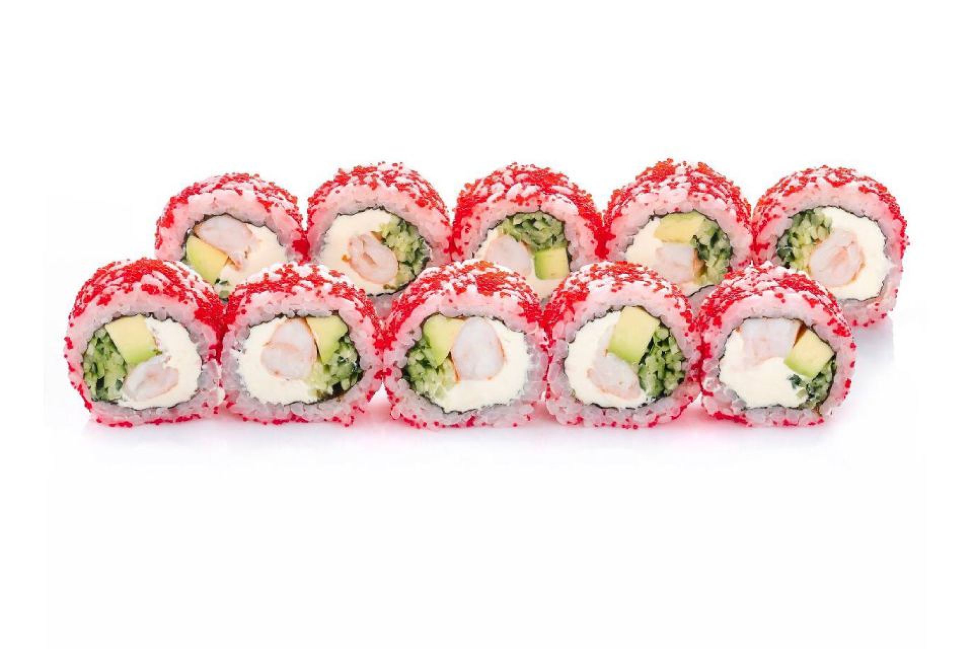 - Каліфорнія з креветкою (креветка тигрова, філадельфія, авокадо, огірок, ікра тобіко, рис)
