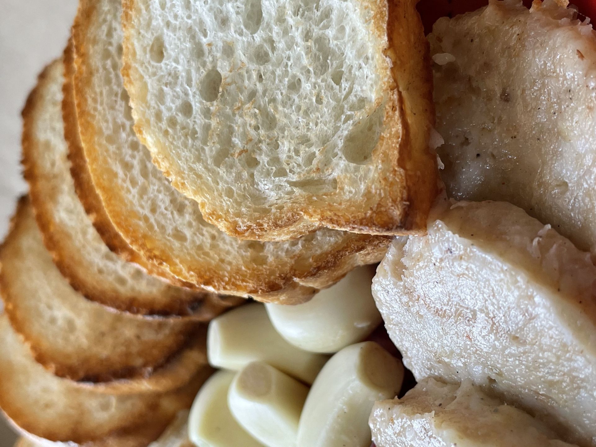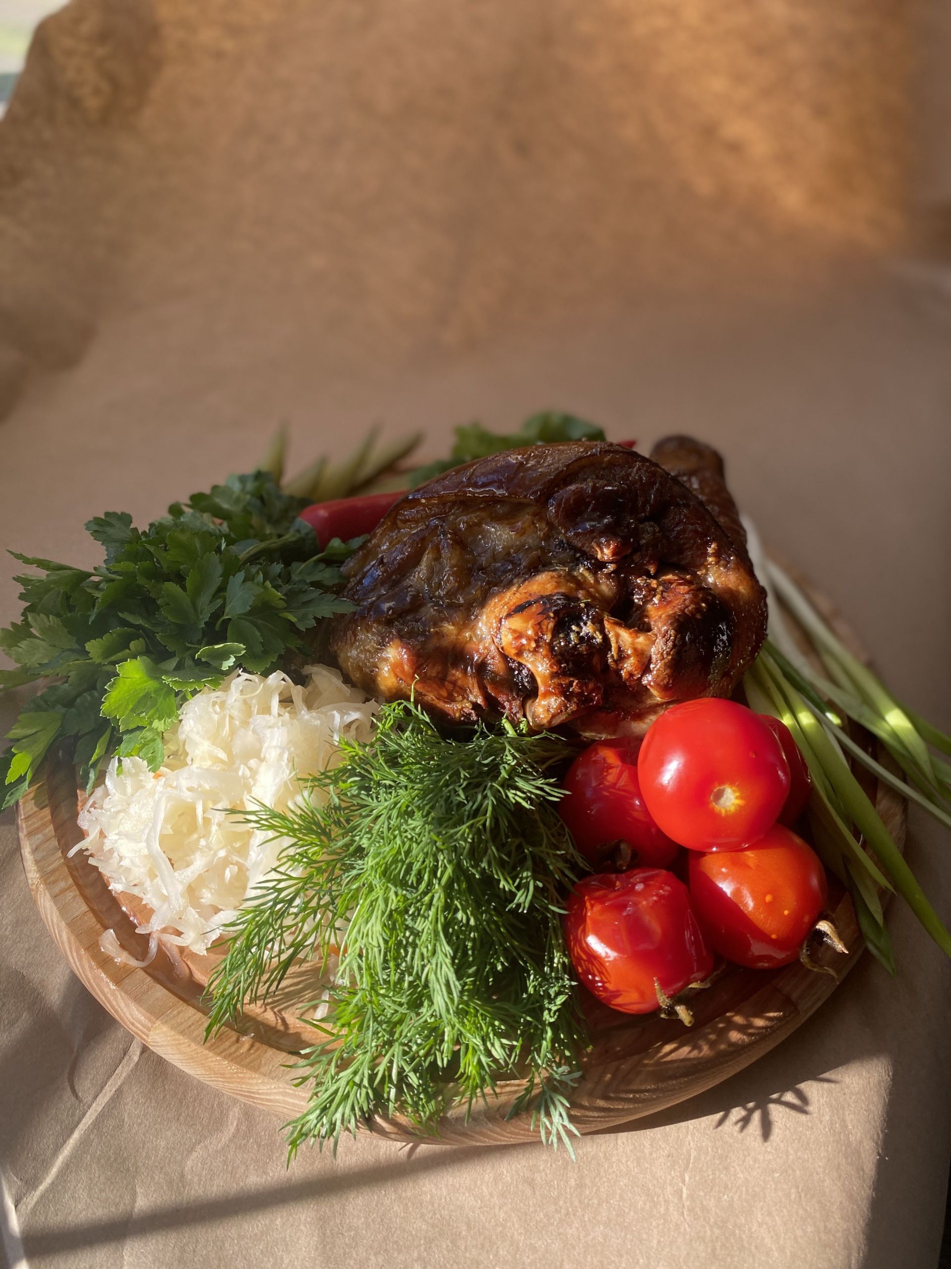 В набір входить: Ковбаса, мясо, підчеревина, сало з часником, сирна запіканка, грінки з чіабати, яйця, масло, гірчиця, хрін, паска