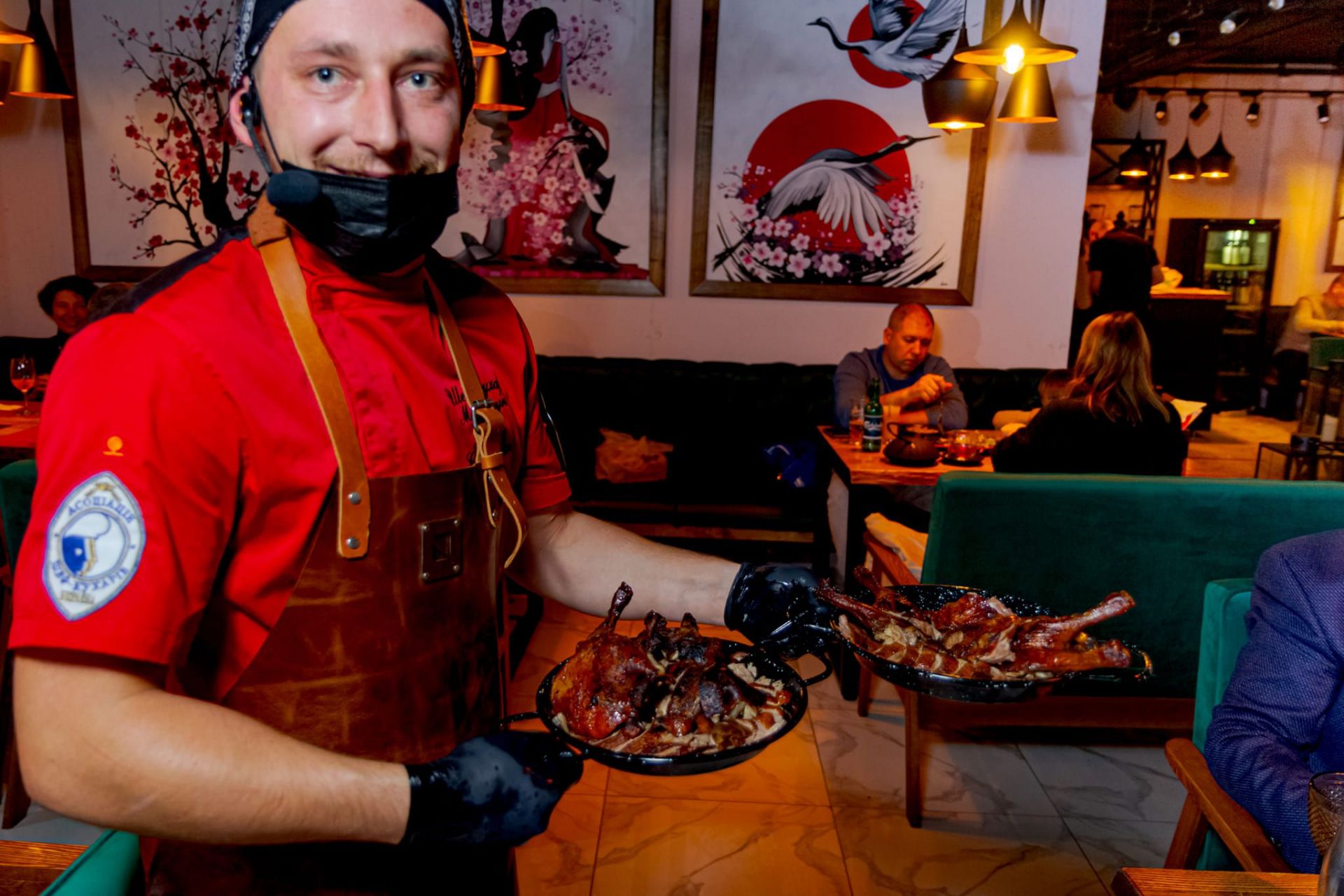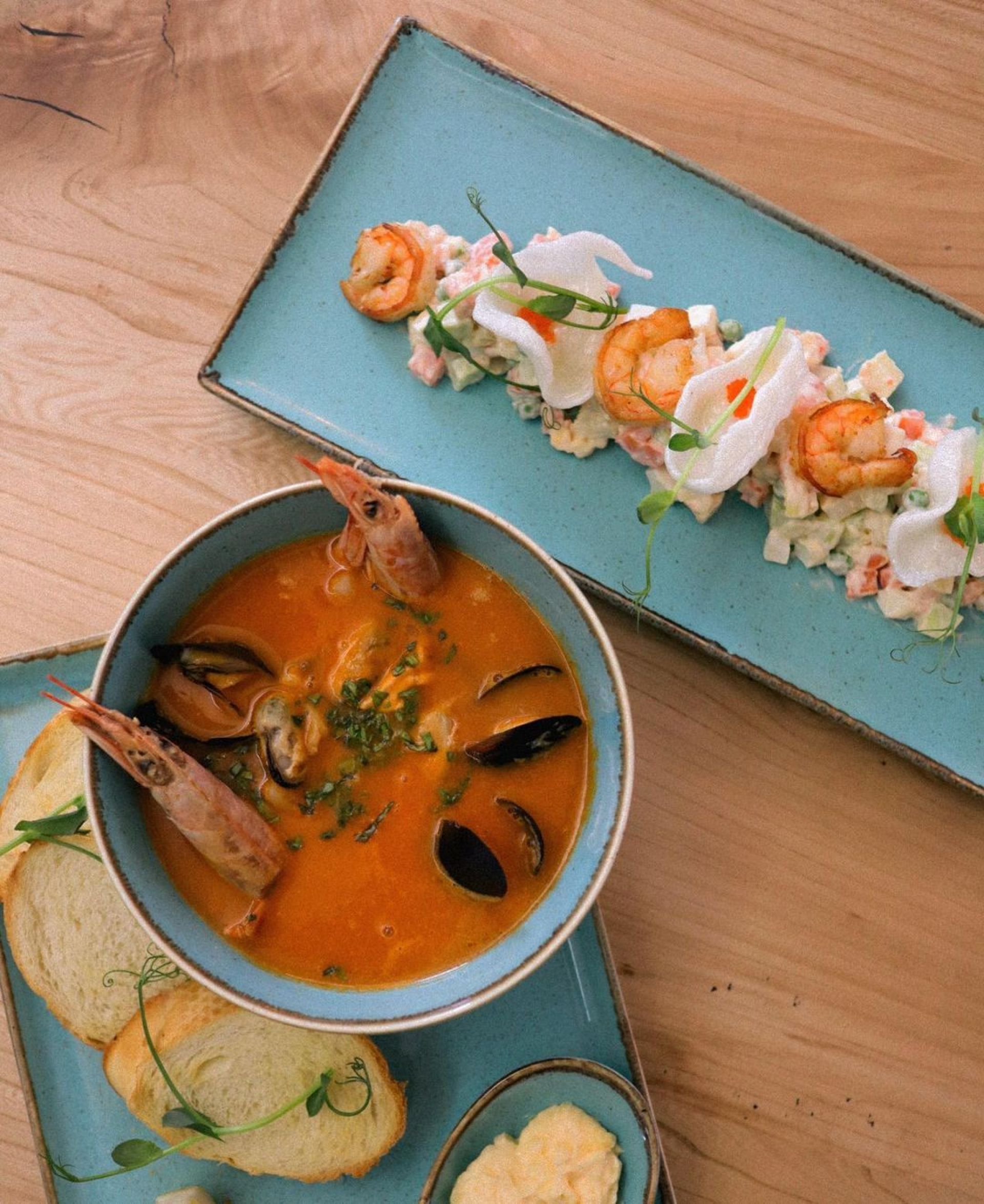 Серед страв ви можете скуштувати, наприклад, філе коропа смажене у кукурудзяному борошні, крем-суп з лосося, олів'є з лососем та креветками.