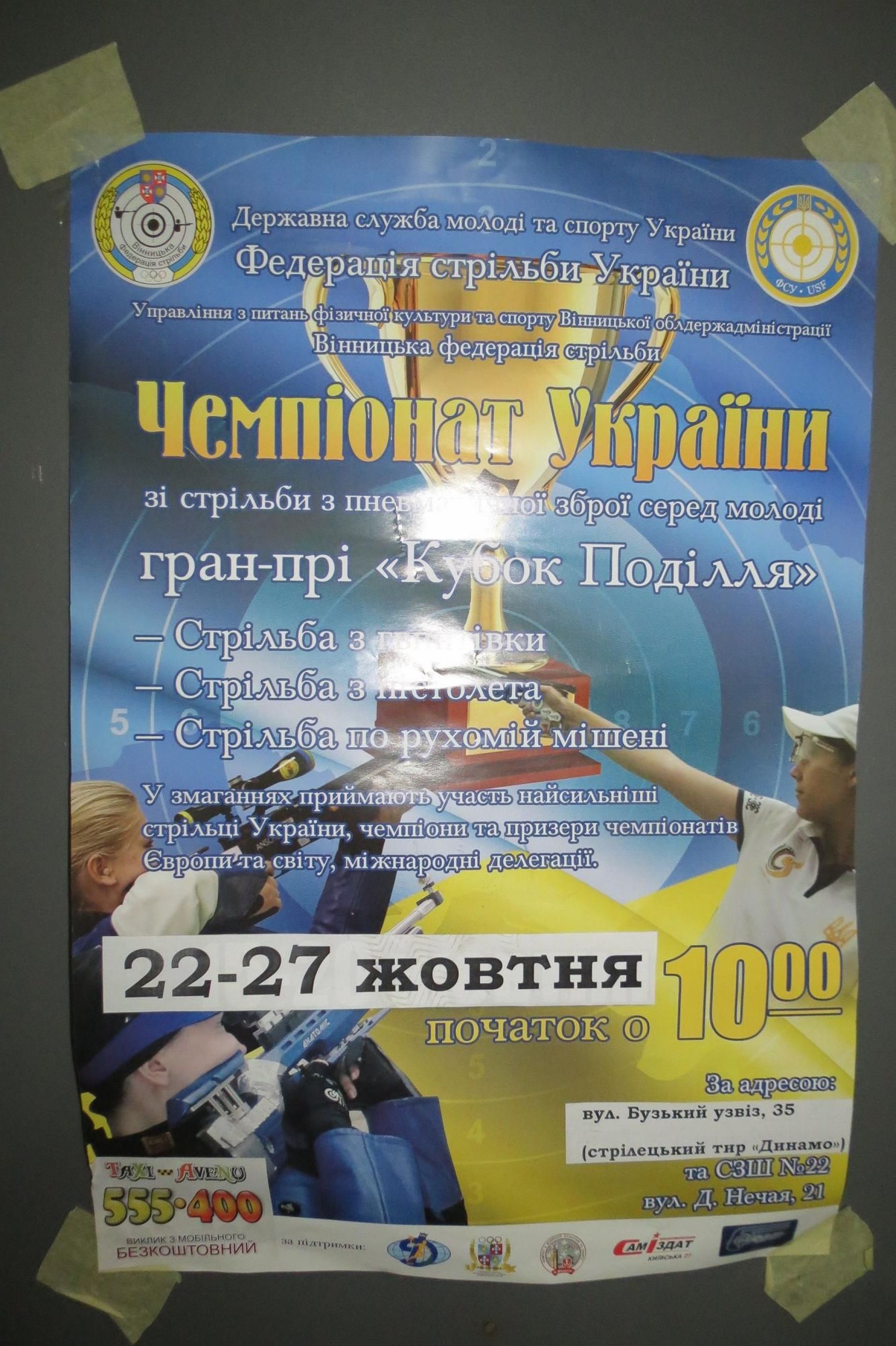 У Вінниці провели традиційний міжнародний форум стрільців. До нього входили відкритий чемпіонат України серед юніорів (1999 р.н. і молодше) зі стрільби з пневматичної зброї і міжнародні змагання «Кубок Поділля» пам’яті срібного призера мюнхенської Олімпіади, вінничанина Бориса Мельника. Медалі розігрувалися у трьох видах програми: пістолет, гвинтівка і кабан, що біжить. Стартували 300 стрільців з України, Вірменії і Молдови.