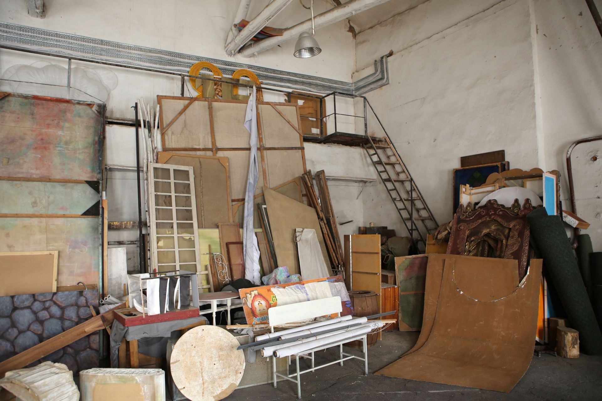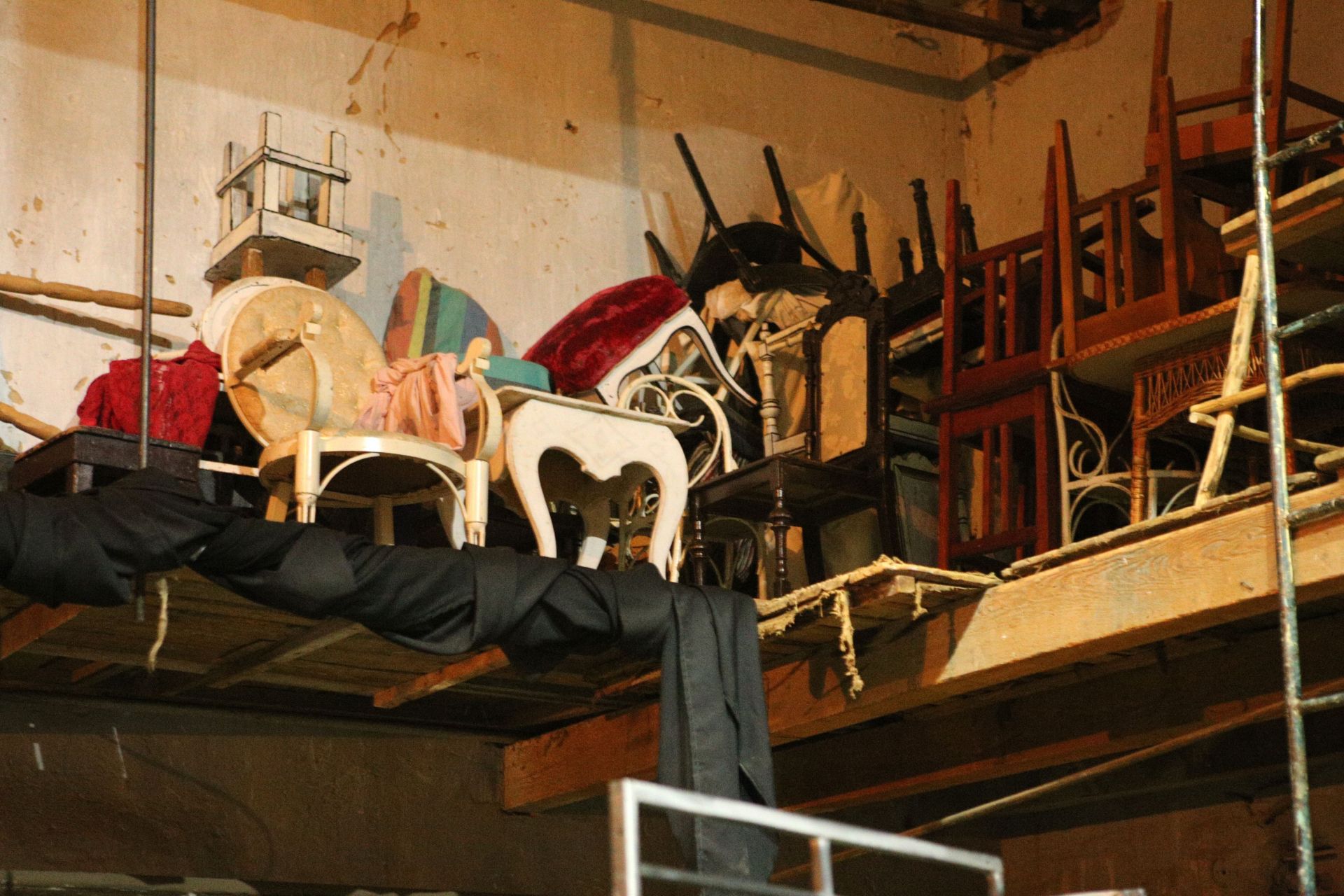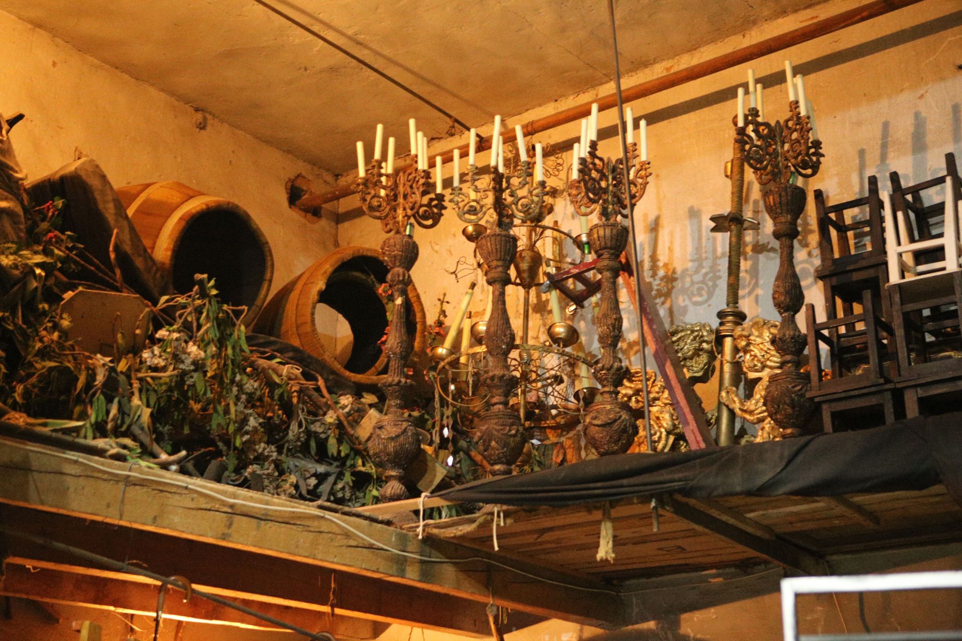 А на горищі розташована майстерня. Цех, де виготовляють декорації для вистав. Масштабні конструкції спускають на сцену за допомогою великого вікна та спеціальних механізмів. Відверто, горище нагадує склад непотребу, але атмосфера тут вражає.