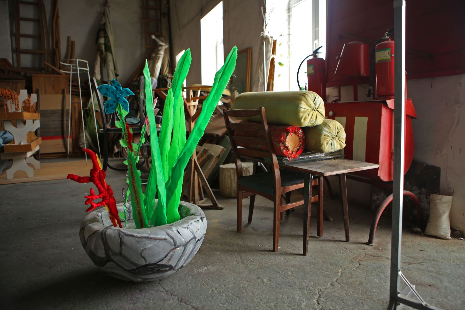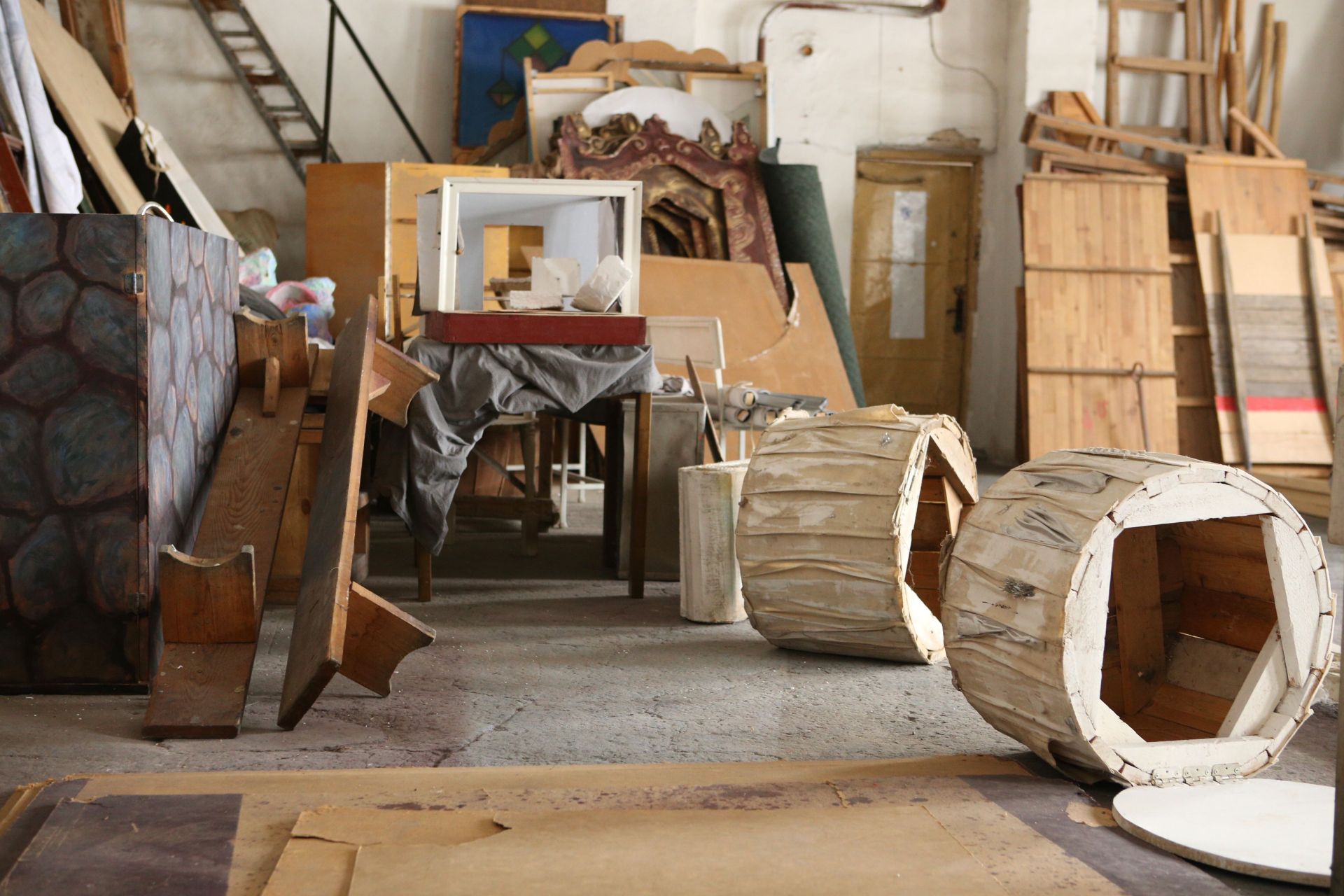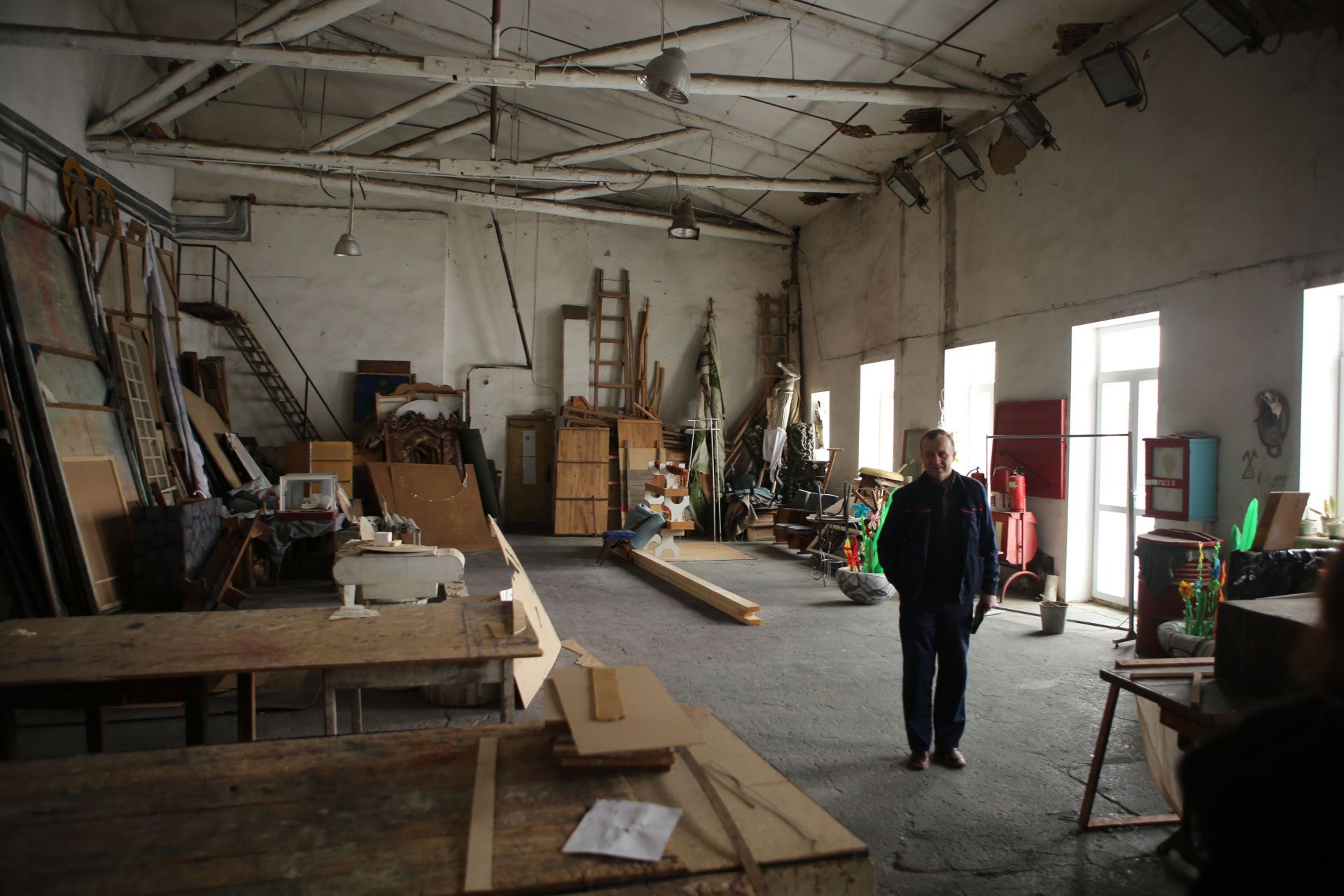 А на горищі розташована майстерня. Цех, де виготовляють декорації для вистав. Масштабні конструкції спускають на сцену за допомогою великого вікна та спеціальних механізмів. Відверто, горище нагадує склад непотребу, але атмосфера тут вражає.