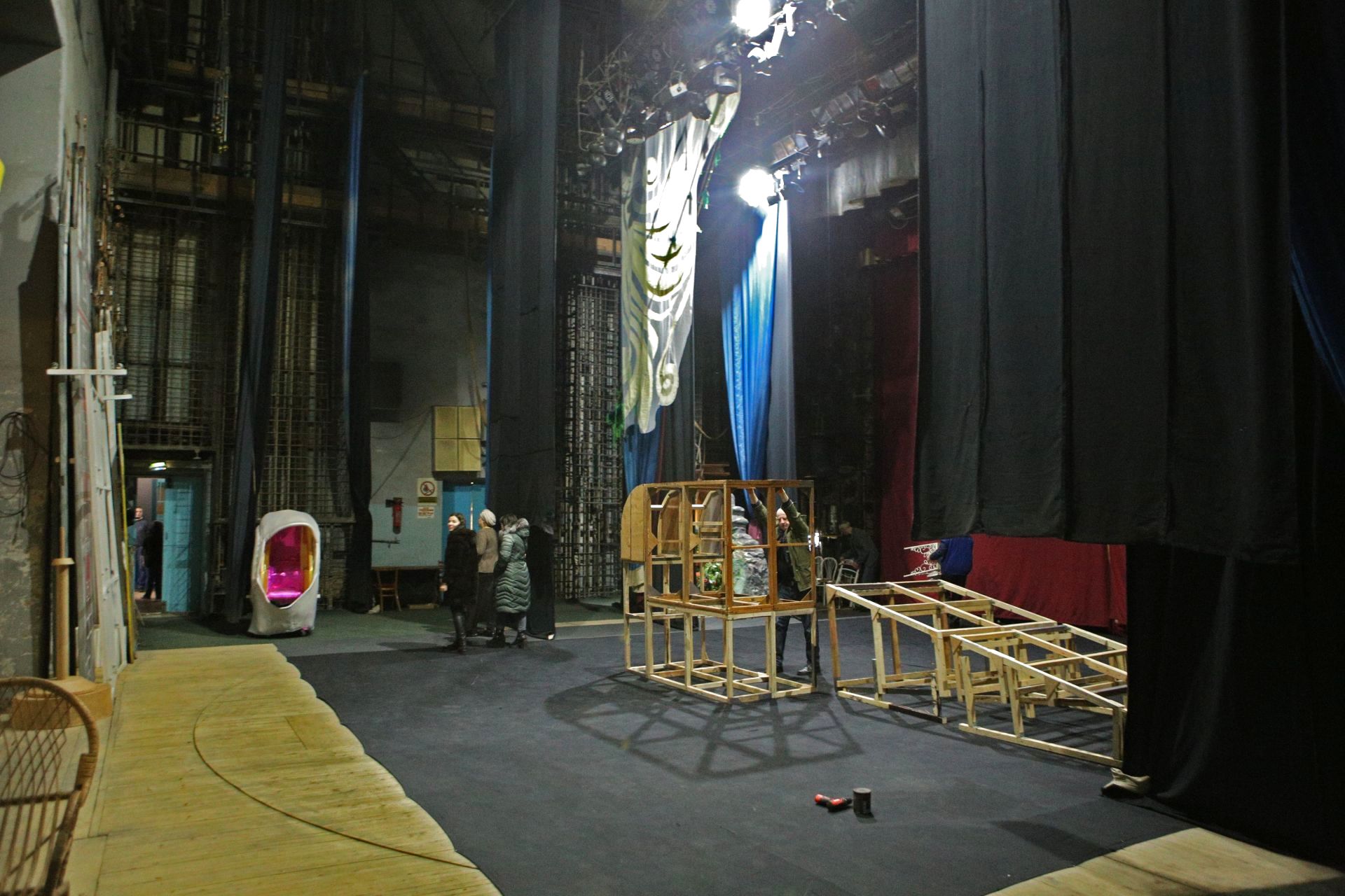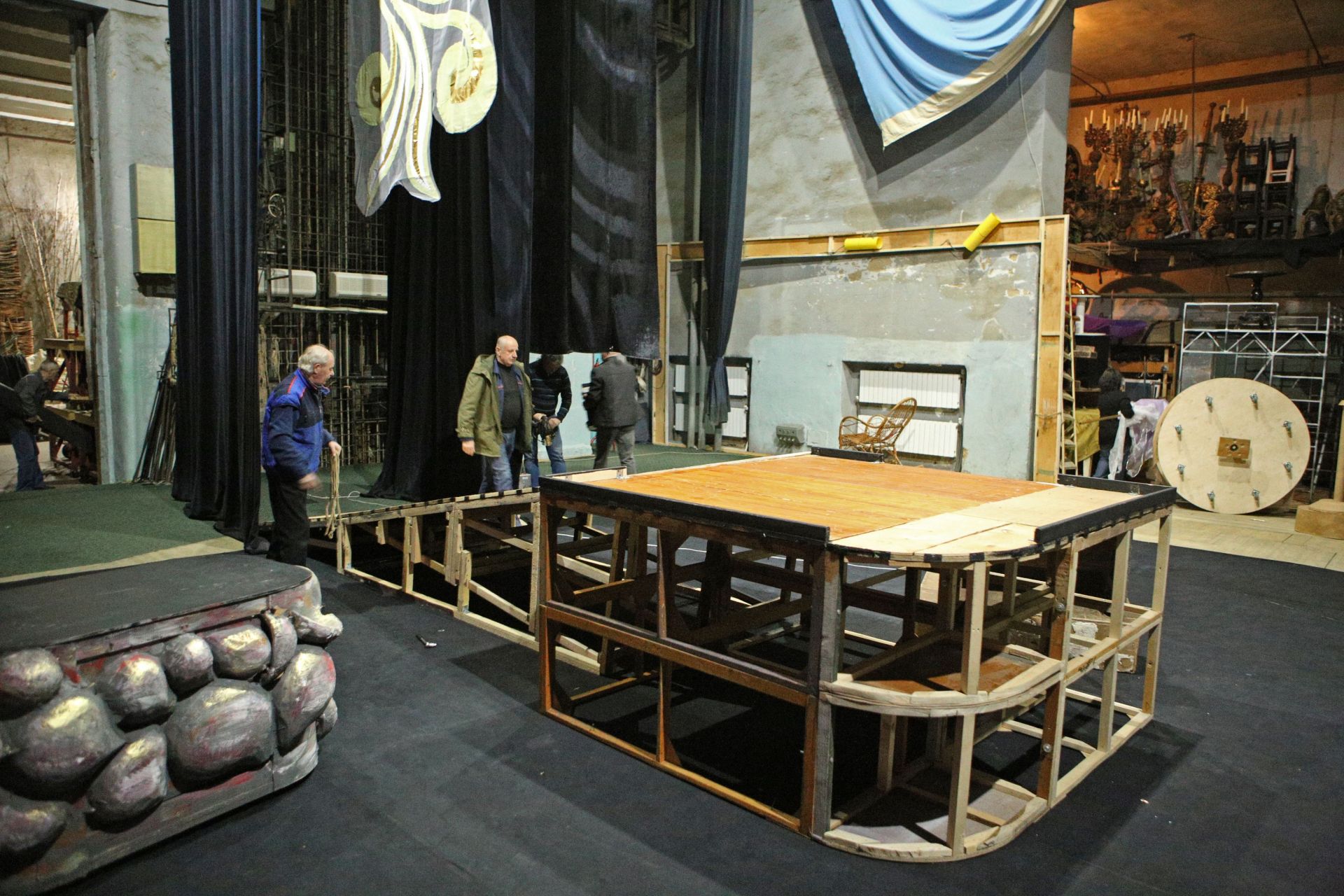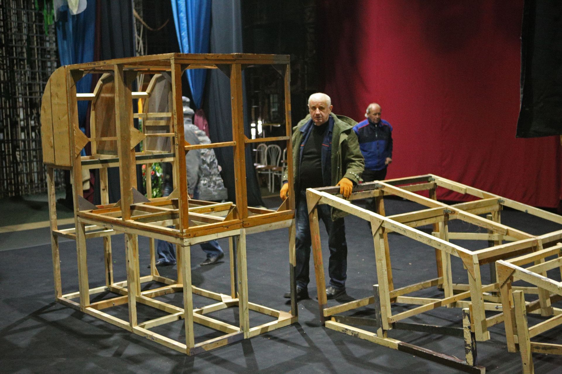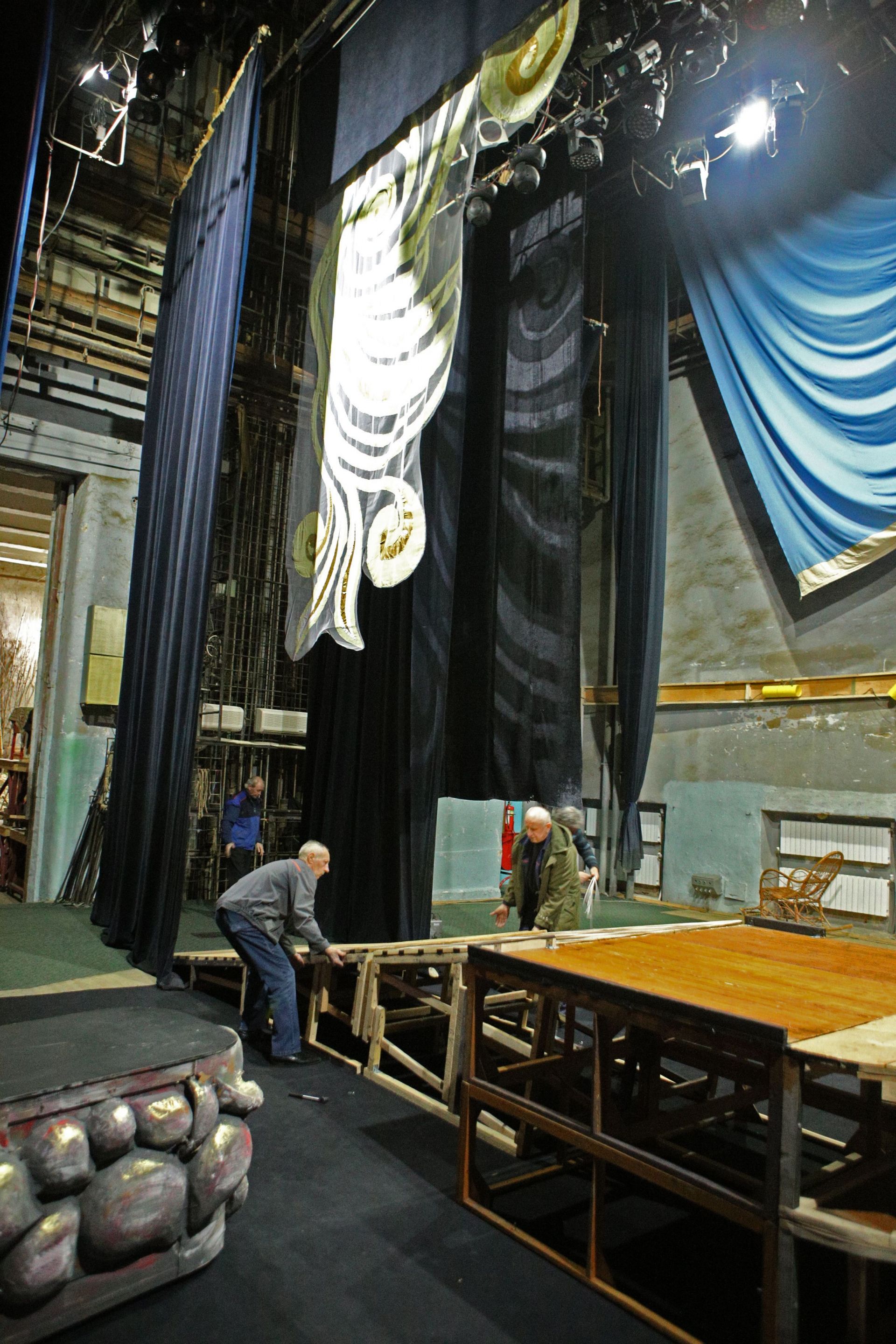 А тим часом на сцені вже працюють чоловіки, які збирають декорації та ховають їх у величезні «кишені» сцени.