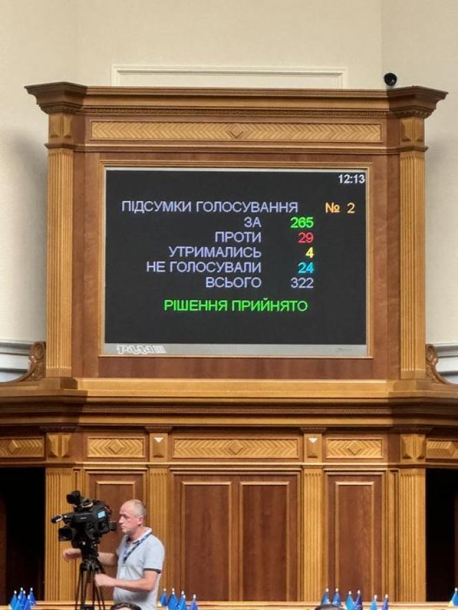 За відповідне рішення проголосували 265 народних депутатів. Про це повідомив народний депутат Ярослав Железняк.