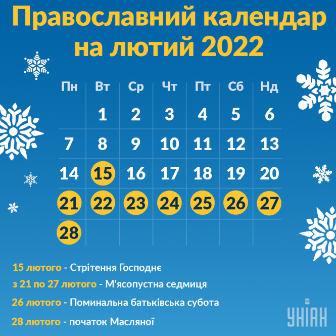 Серед великих релігійних: Собор трьох святителів (12 лютого), Стрітення Господнє (15 лютого), Вселенська батьківська м’ясопусна субота (26 лютого), а також від 26 лютого починається Масниця.
