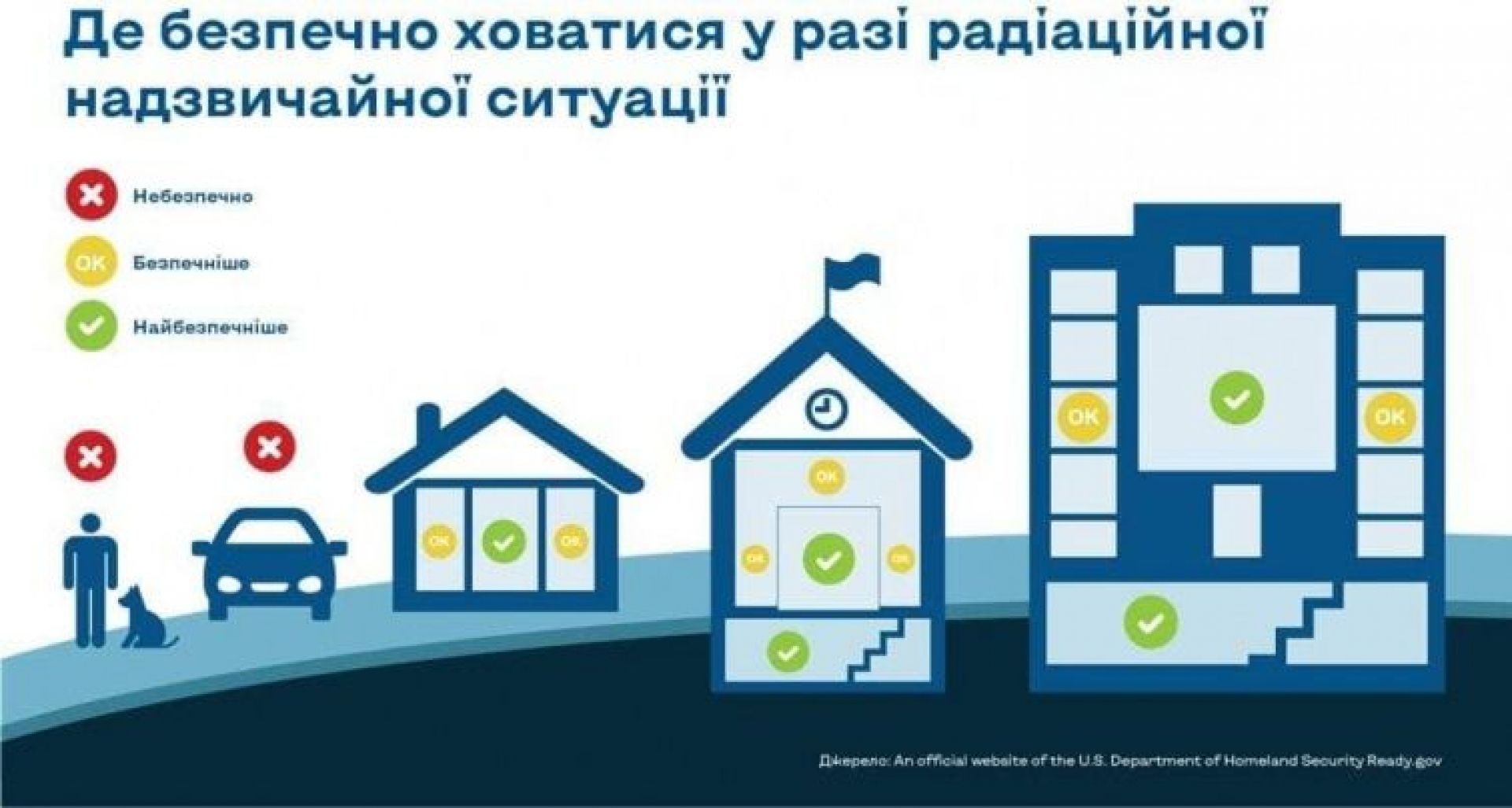 - сховайтеся якомога швидше, навіть якщо ви знаходитеся декілька кілометрів від точки вибуху, адже радіоактивні опади можуть розноситися вітром.