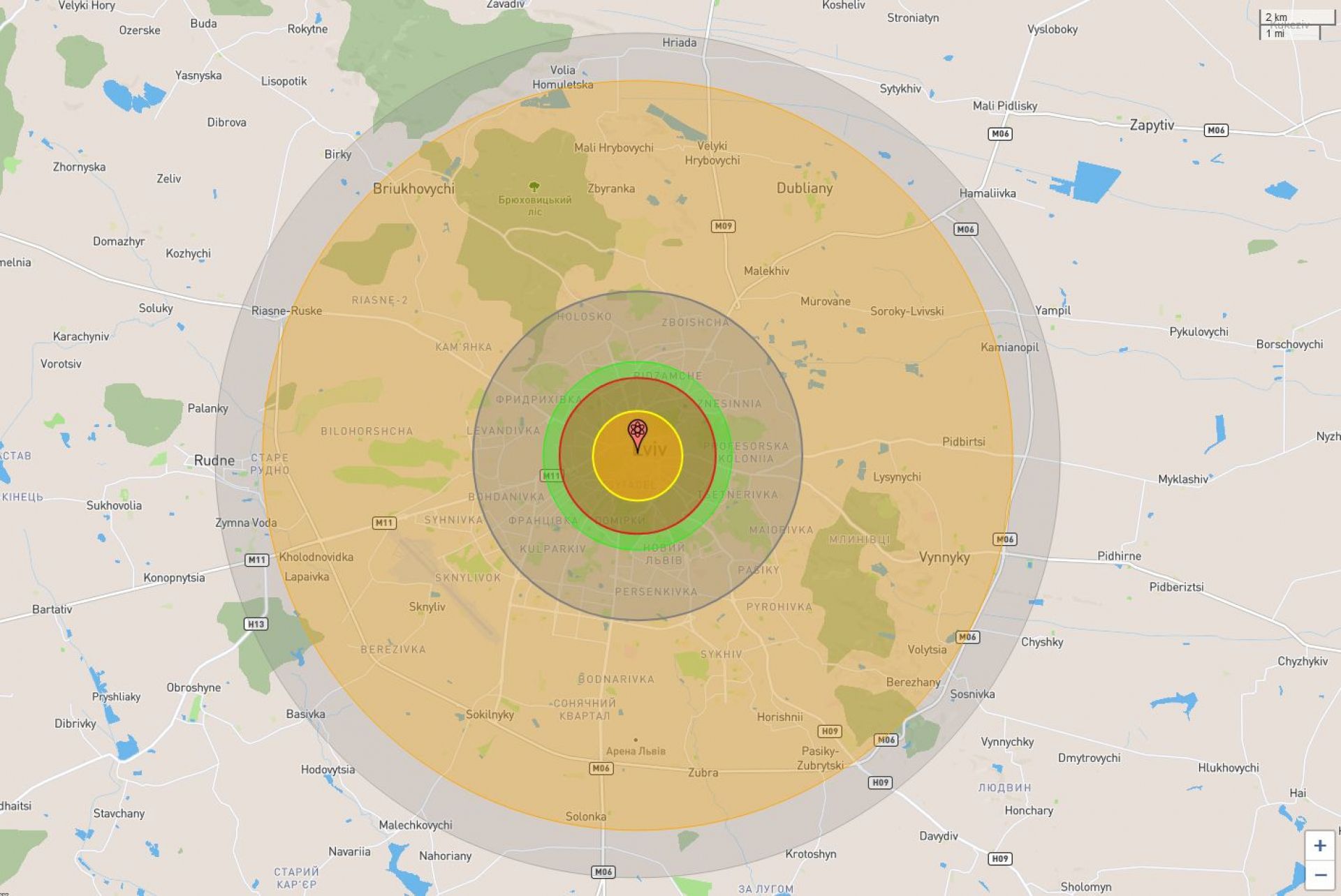 Удар стратегічною ядерною ракетою, наприклад, по Львову буде в рази руйнівнішим. Зазначимо, що навіть найбільші песимісти в редакції не вірять у застосування стратегічної ядерної зброї проти України. Серйозних руйнувань може зазнати майже все місто (яскраво-оранжевий, червоний і темно-сірий кольори), а пожежі поширяться далеко за його межі (світло-оранжевий колір).