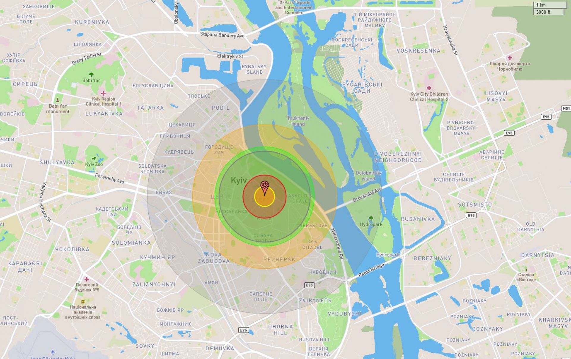 Ми скористалися сервісом NUKEMAP, щоб візуалізувати розмір цих зон у разі гіпотетичного ядерного удару по центру Києва.
