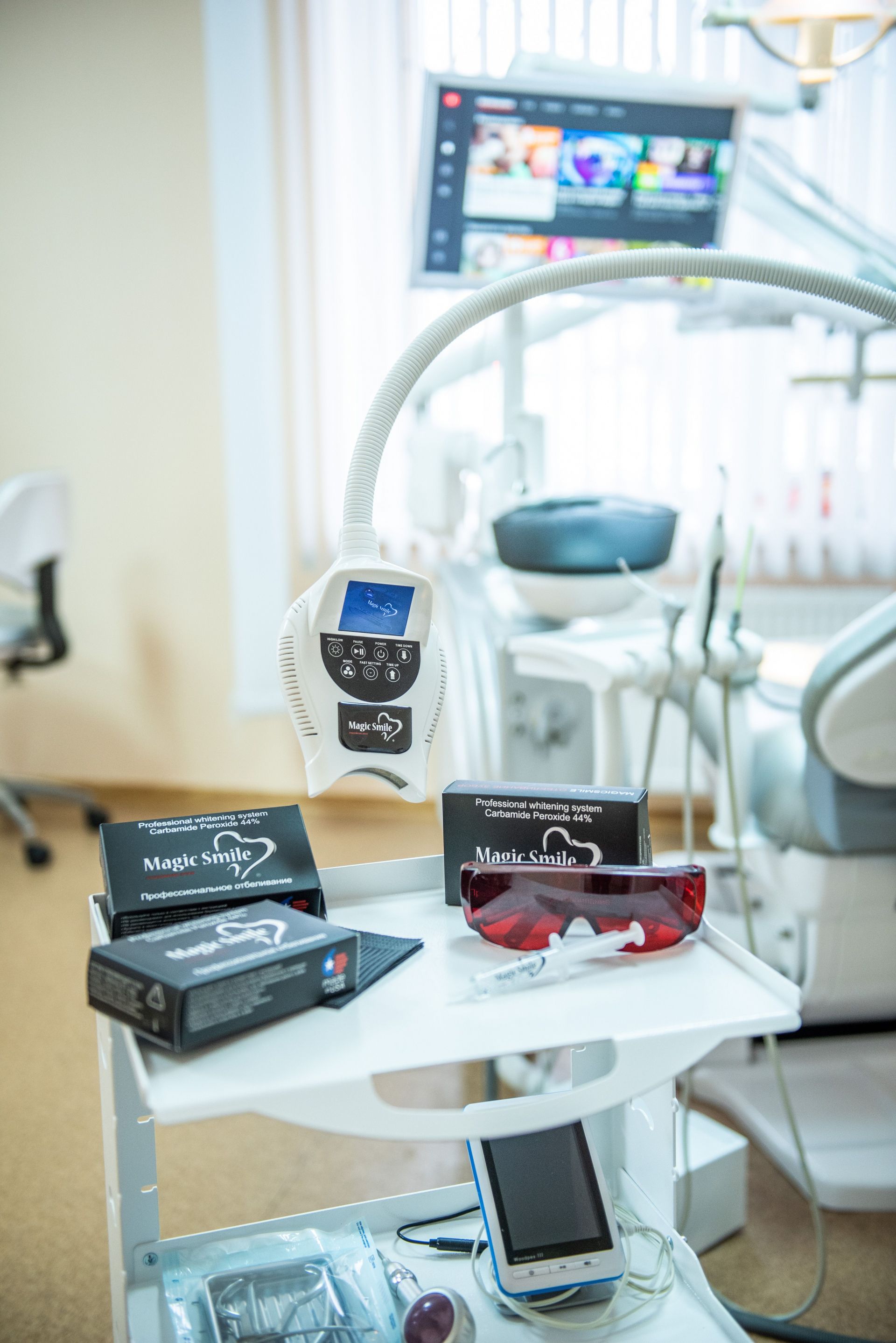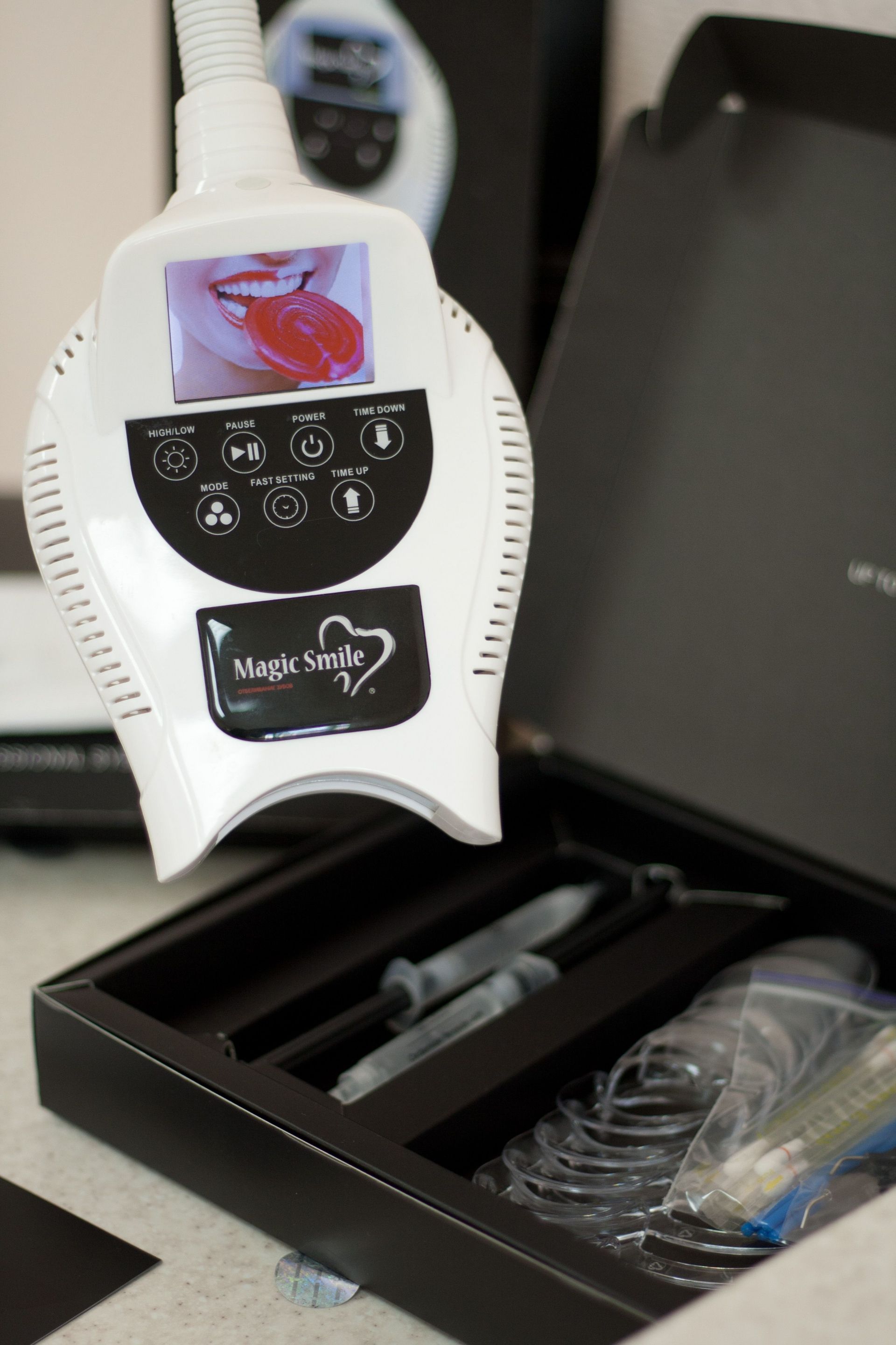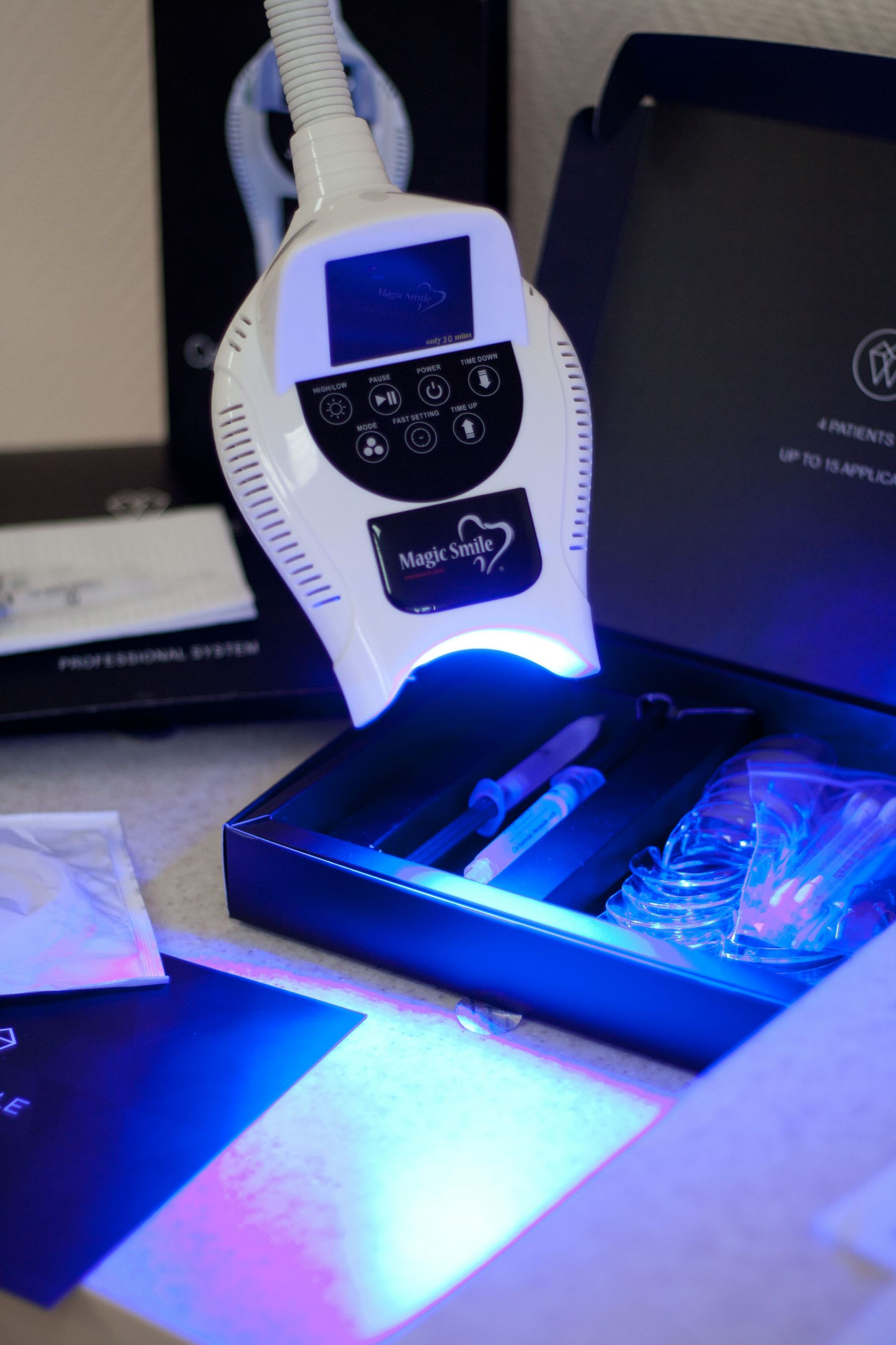 Ми застосовуємо систему Magic Smile, яка успішно використовується протягом 7 років та чудово зарекомендувала себе в найкращих клініках по всьому світу. При цьому відбілюванні не застосовується ультрафіолет, кислоти та абразивні речовини, а ефект вражаючий - відбілювання до 9-ти тонів. Основою комплексу Magic Smile є лагідний гіпоалергенний гель з пероксидом карбоміду. Він активізується професійною LED-лампою MagicLightPro. Усе обладнання сертифіковано в Україні, а випромінювання лампи має низьку температуру хвиль, що є цілком безпечно, на відміну від інфрачервоного чи ультрафіолетового опромінення. Застосування лампи не спричиняє сухість слизової рота, а емаль не перегрівається.