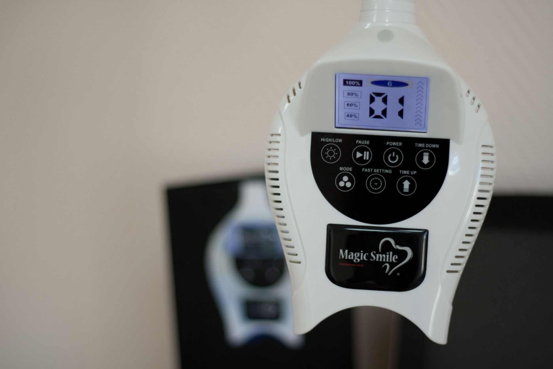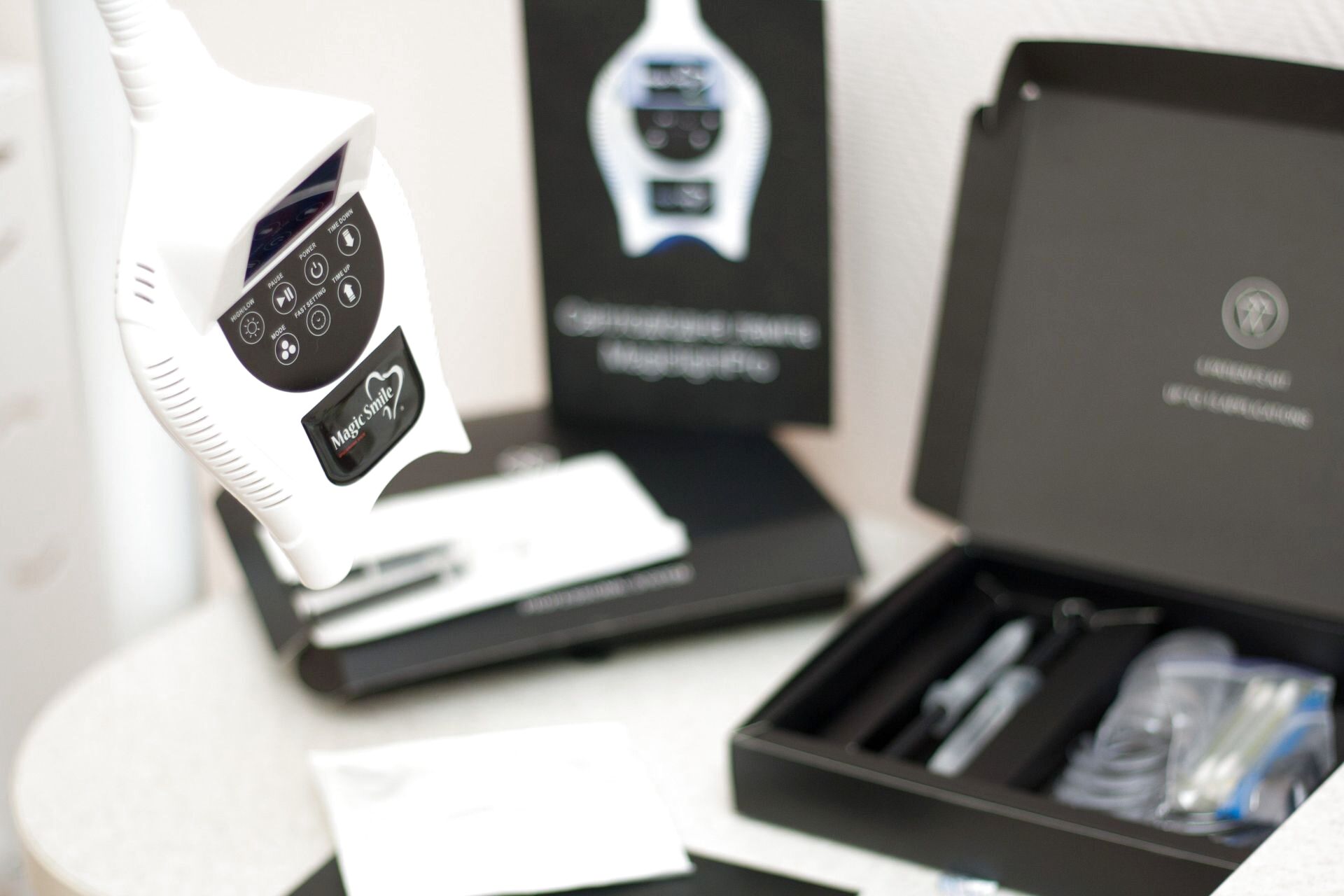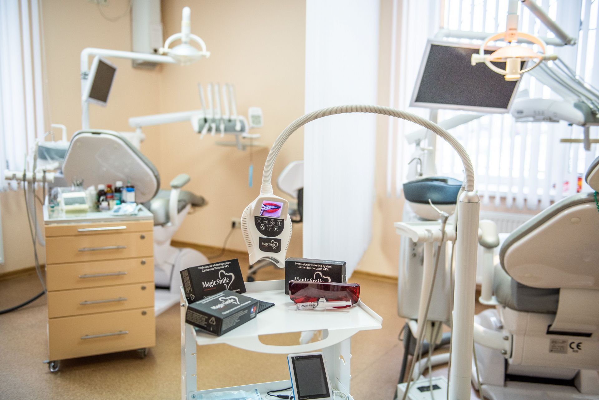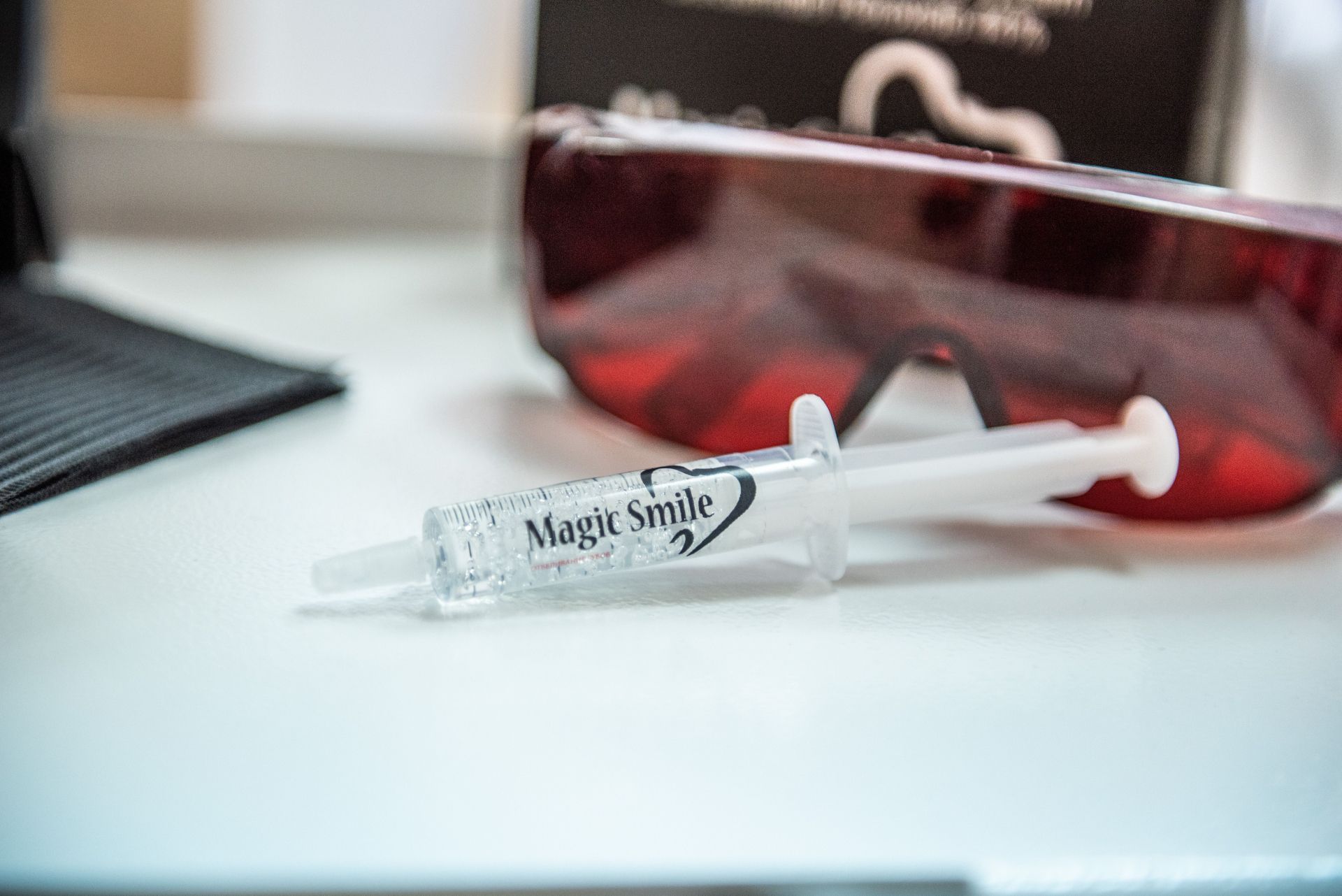 Ми застосовуємо систему Magic Smile, яка успішно використовується протягом 7 років та чудово зарекомендувала себе в найкращих клініках по всьому світу. При цьому відбілюванні не застосовується ультрафіолет, кислоти та абразивні речовини, а ефект вражаючий - відбілювання до 9-ти тонів. Основою комплексу Magic Smile є лагідний гіпоалергенний гель з пероксидом карбоміду. Він активізується професійною LED-лампою MagicLightPro. Усе обладнання сертифіковано в Україні, а випромінювання лампи має низьку температуру хвиль, що є цілком безпечно, на відміну від інфрачервоного чи ультрафіолетового опромінення. Застосування лампи не спричиняє сухість слизової рота, а емаль не перегрівається.