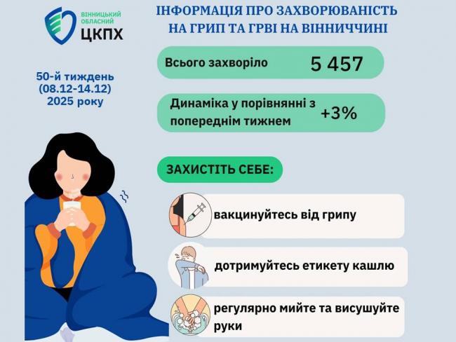 У Вінницькій області за минулий тиждень виявили 5 457 випадків ГРВІ, грипу та COVID-19 — на 3% більше, ніж попереднього тижня, проте показники залишаються значно нижчими за епідеміологічний поріг, повідомляє Вінницький обласний центр контролю та профілактики хвороб.