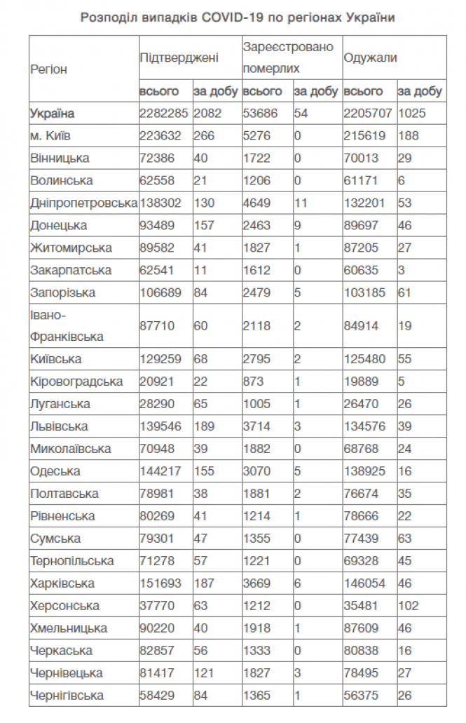 - Кількість інфікованих COVID-19 людей сягає понад 2,2 мільйона, одужали — 2,2 мільйона.