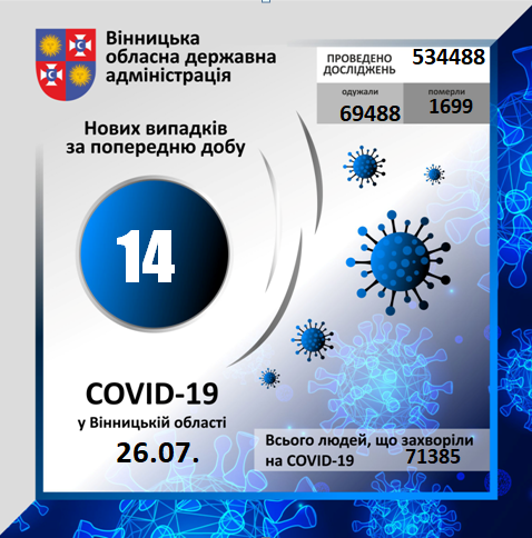 - Загалом на Вінниччині зафіксували 71 тисячу 385 випадків. 14 нових за добу.