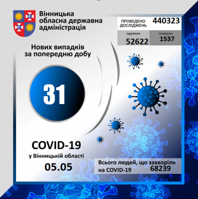Загалом на Вінниччині зафіксували 68 тисяч 239 випадків. 31 новий за добу.