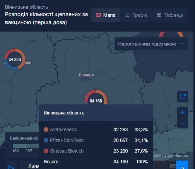 У Вінницькій області першу дозу отримали — 84 160 людей, другу — 33 139.