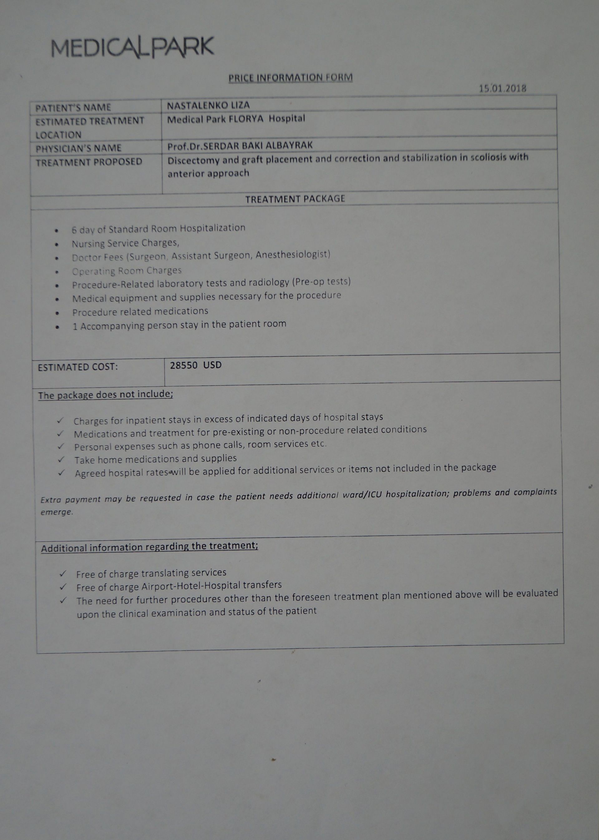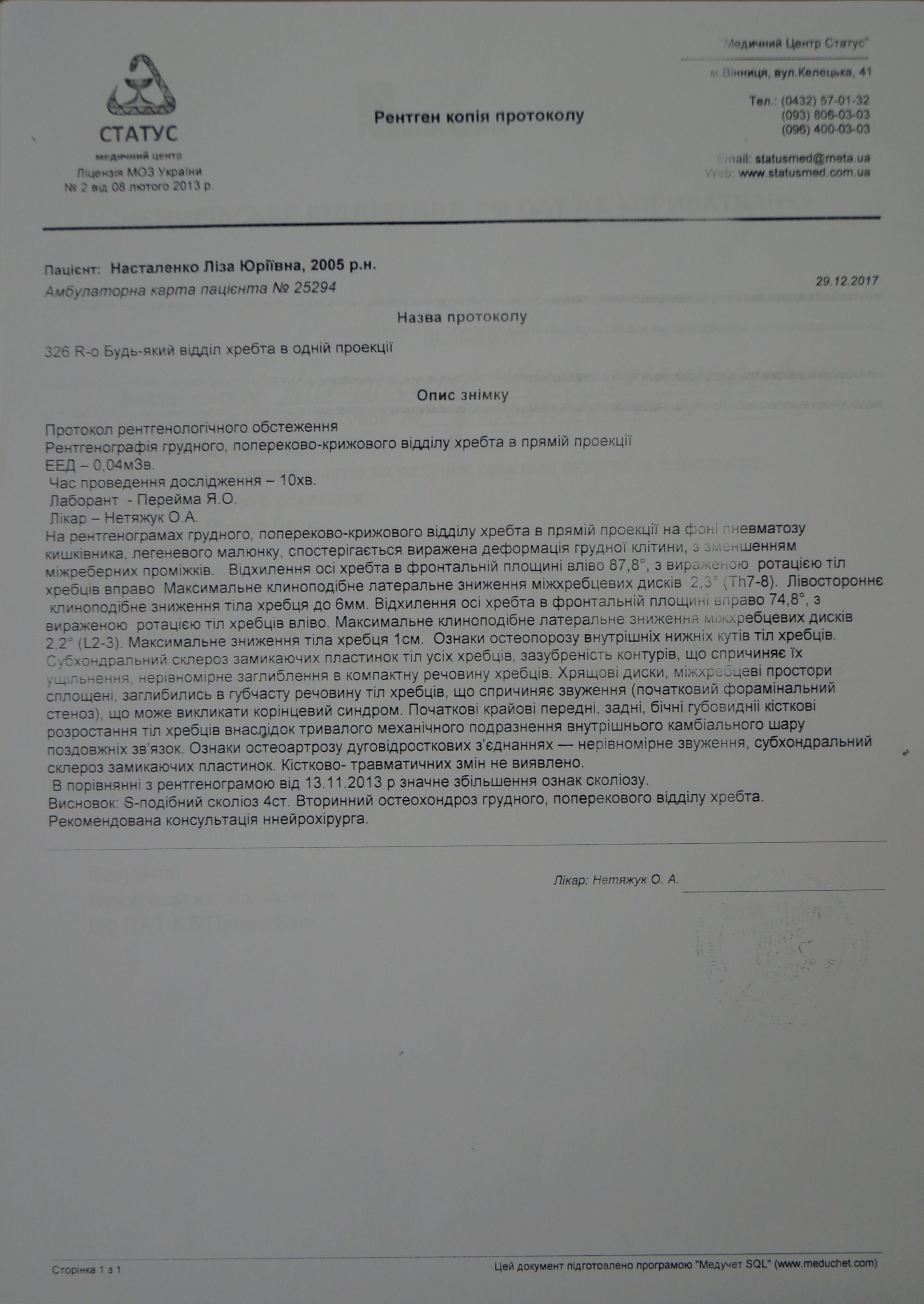 – У Лізи хребет не просто викривлений, він ще й прокручений по своїй осі, – розповідає батько Юрій Насталенко. – Лікарі нам казали, що треба буде робити операцію, але не раніше 15 років. Коли дитина перестає інтенсивно рости. Та хвороба почала дуже швидко прогресувати і ми більше не можемо чекати.