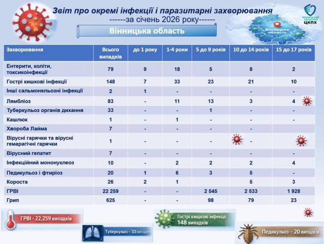 Головний удар у перший місяць року припав на дихальну систему мешканців області — лікарі зареєстрували понад 22 тисячі випадків гострих респіраторних інфекцій. Найбільш вразливою групою традиційно стали діти до 17 років, які склали третину від усіх хворих через тісні контакти у навчальних закладах. Паралельно з вірусами вінничан атакували й кишкові інфекції, серед яких переважали отруєння невстановленого походження та лямбліоз. Останній особливо часто виявляли саме у малечі, що ще раз підкреслює важливість ретельної гігієни рук та продуктів харчування навіть у холодну пору року.