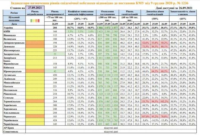 За даними МОЗ, станом на 27 вересня у 5 регіонах перевищено рівень динаміки госпіталізацій із коронавірусом (норма для регіону зеленої зони — не більше ніж 50% хворих), і вони відповідають помаранчевій зоні епідемічної небезпеки: