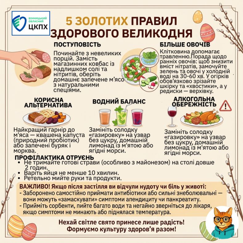 — Чому помірність — це безпека? Різкий перехід від посту до жирної та білкової їжі (крашанки, м’ясо, паска) створює критичне навантаження на органи: