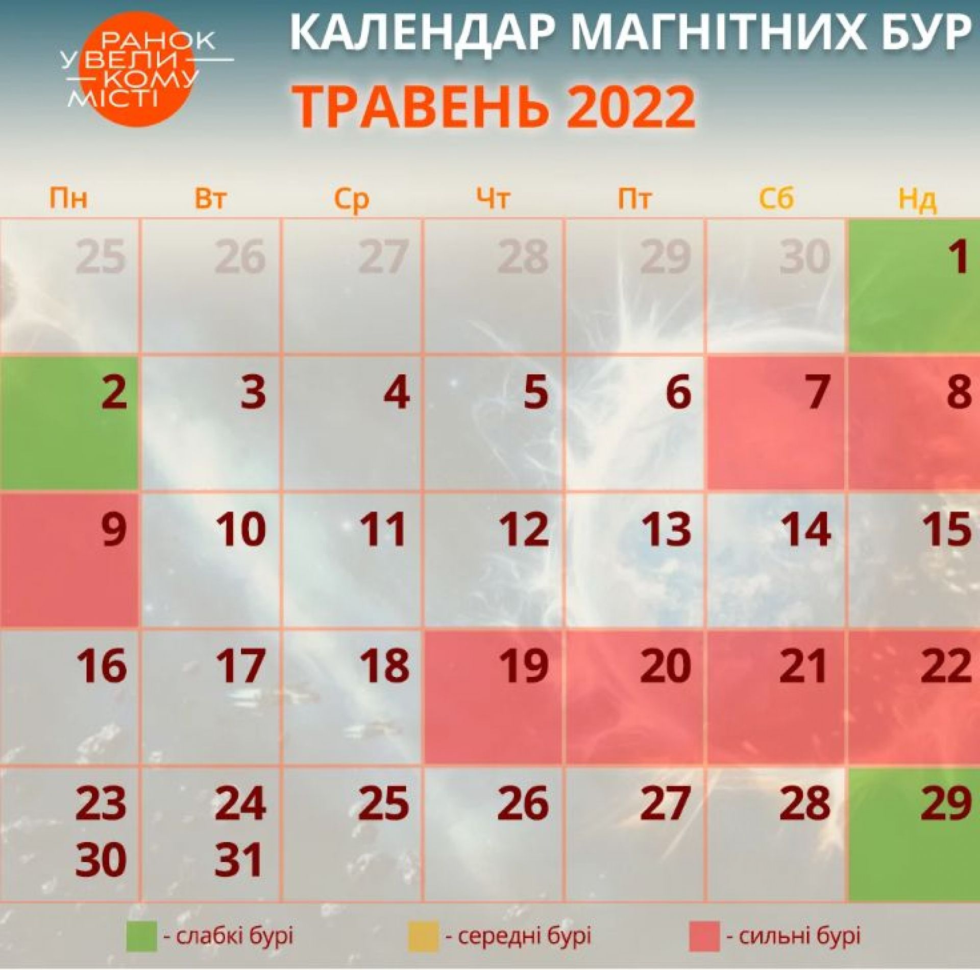 - 19-22 травня — сильна магнітна буря