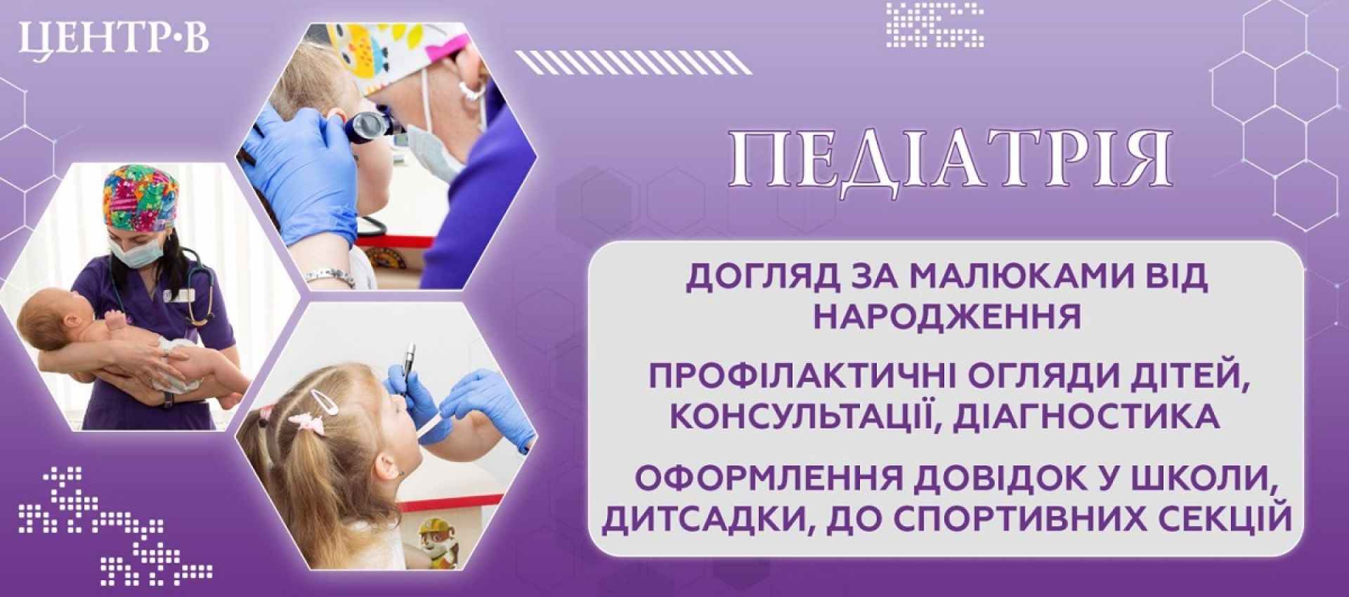 У нашому медичному центрі ми особливо пишаємося педіатричною практикою. Наші досвідчені педіатри надають високоякісну медичну допомогу дітям від народження до підліткового віку. Ми пропонуємо повний спектр педіатричних послуг, включаючи профілактичні огляди, консультацію спеціалістів, вакцинацію та лікування захворювань або ж, відхилень.