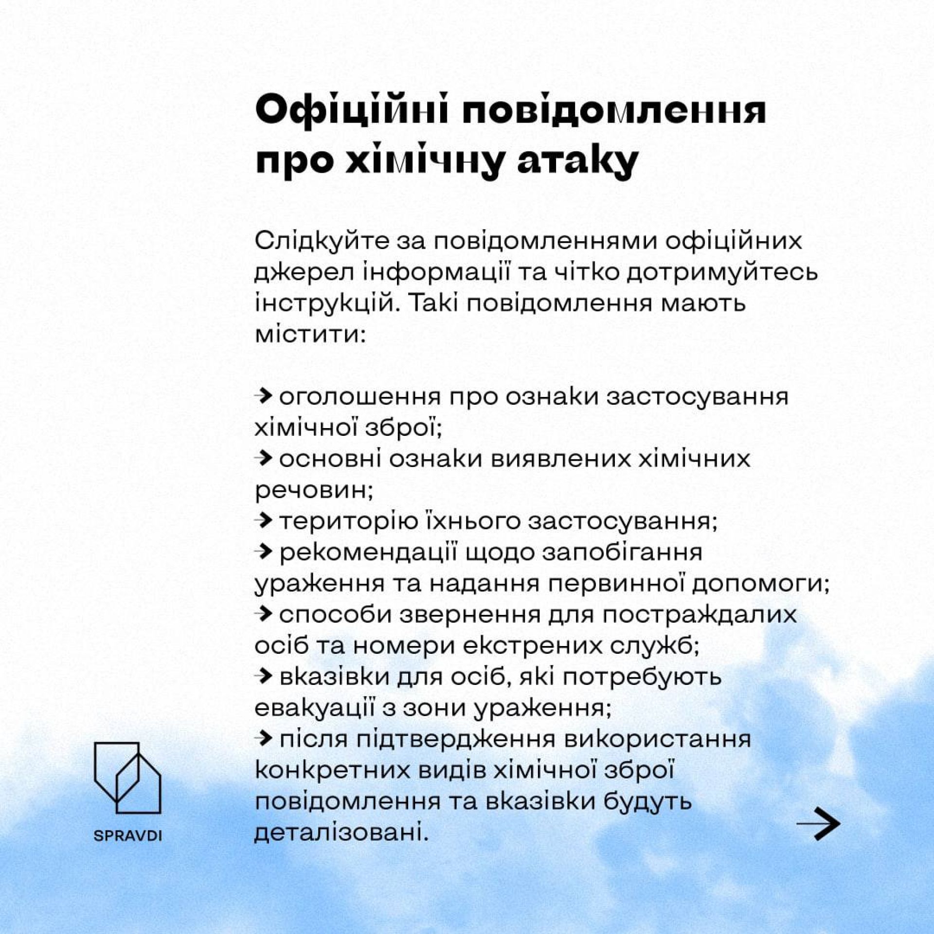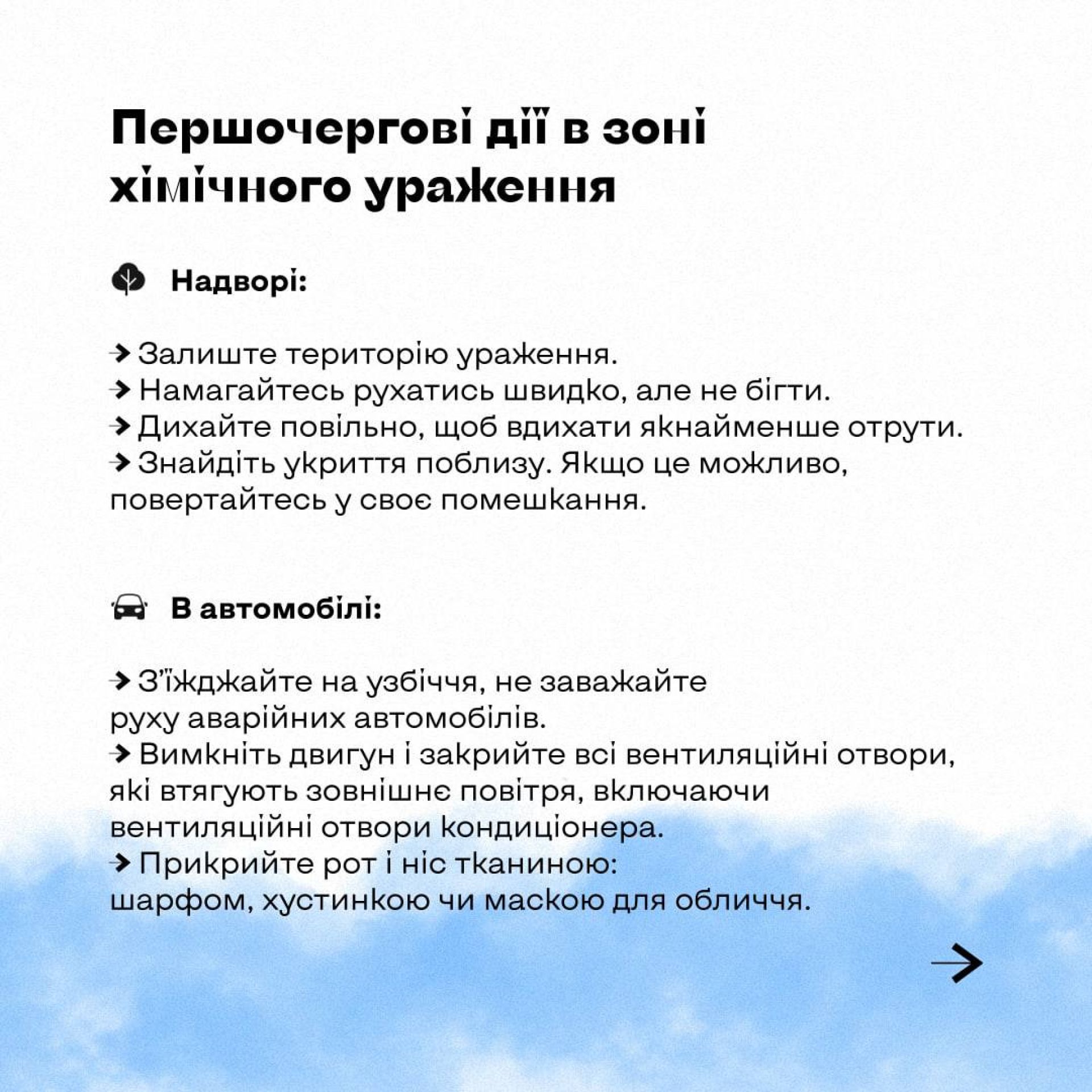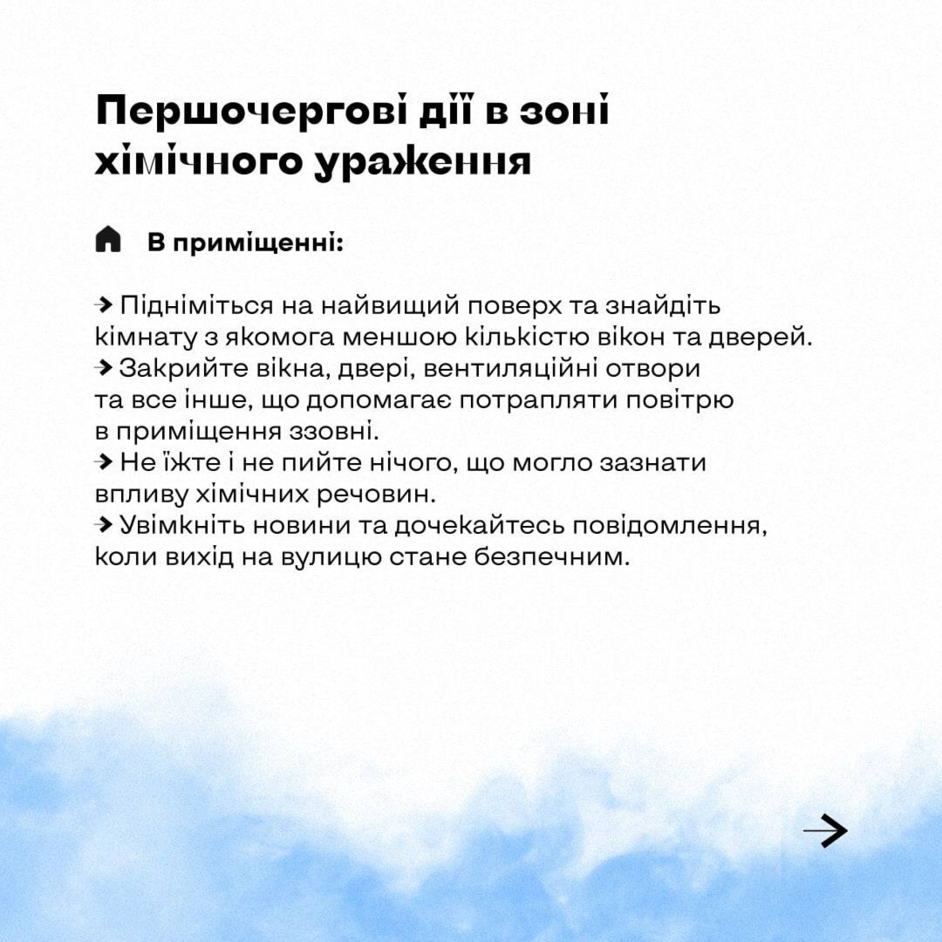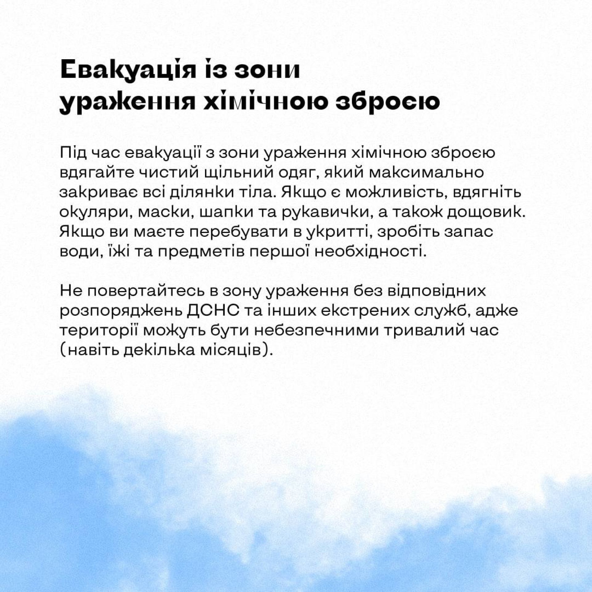 Так само як і про повітряну — через сирени. Після неї через гучномовець мають повідомити: «Загроза хімічного зараження» або «Хімічна небезпека».