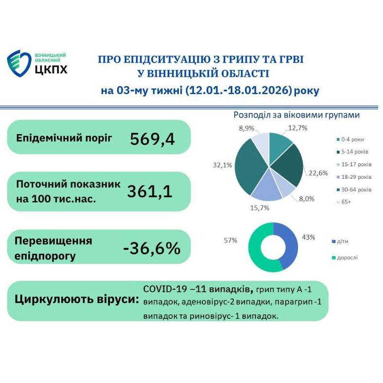 З початку епідемічного сезону 2025–2026 років на грип та ГРВІ у Вінницькій області перехворіли 76 543 жителі, з яких 54% — діти до 18 років. Позитивний результат тесту на COVID-19 за цей період отримали 1 037 осіб, у тому числі 213 дітей. Загалом до закладів охорони здоров’я області було госпіталізовано 3 572 пацієнти, з них 2 055 діти.