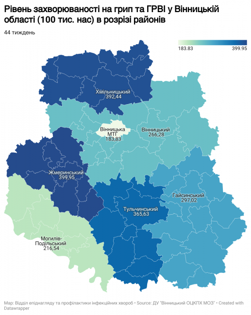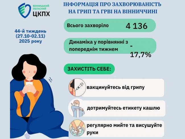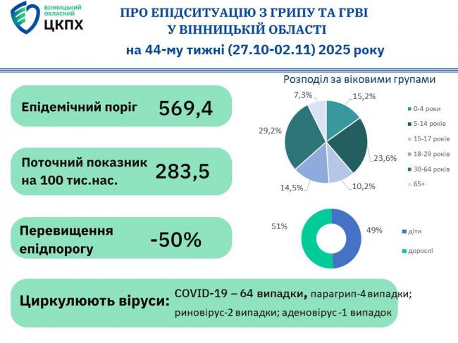 У Вінницькій області рівень захворюваності на гострі респіраторні інфекції, грип та COVID-19 залишається нижчим за епідемічний поріг. За період із 27 жовтня по 2 листопада (44 тиждень року) медики зареєстрували 4136 випадків хвороби. Порівняно з попереднім тижнем цей показник зріс на 17%, однак він усе ще становить приблизно половину від епідемічного рівня.