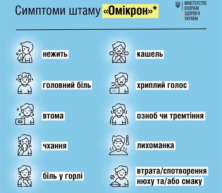 Ймовірно, що це штам «Омікрон», бо симптоми захворювання нагадують класичну гостру респіраторну вірусну інфекцію. Спостерігається підвищення температури, закладеність носа, нежить, чхання, біль у горлі, головний біль, слабкість, можуть бути і диспептичні розлади (розлади травлення).