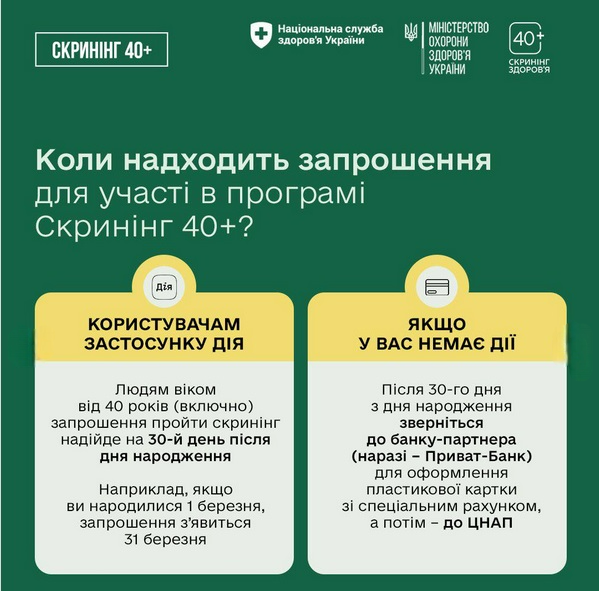 - Запрошення пройти обстеження надходить автоматично в Дію — на 30-й день після дня народження всім, кому виповнилося 40 років або більше.