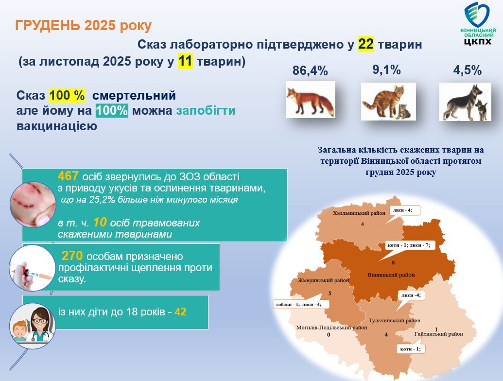 Станом на 1 січня 2026 року сказ лабораторно підтвердили у 146 тварин, що в 1,4 раза більше, ніж за аналогічний період минулого року (101 випадок). Про це повідомили на Facebook-сторінці Вінницького обласного центру контролю та профілактики хвороб МОЗ.