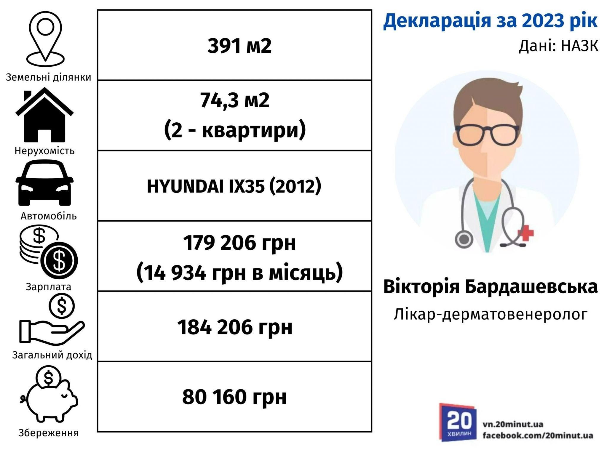 Наступним членом комісії є Вікторія Бардашевська. Вона лікар-дерматовенеролог. Землі Вікторія має 391 м² та дві квартири, загальною площею 74,3 м².