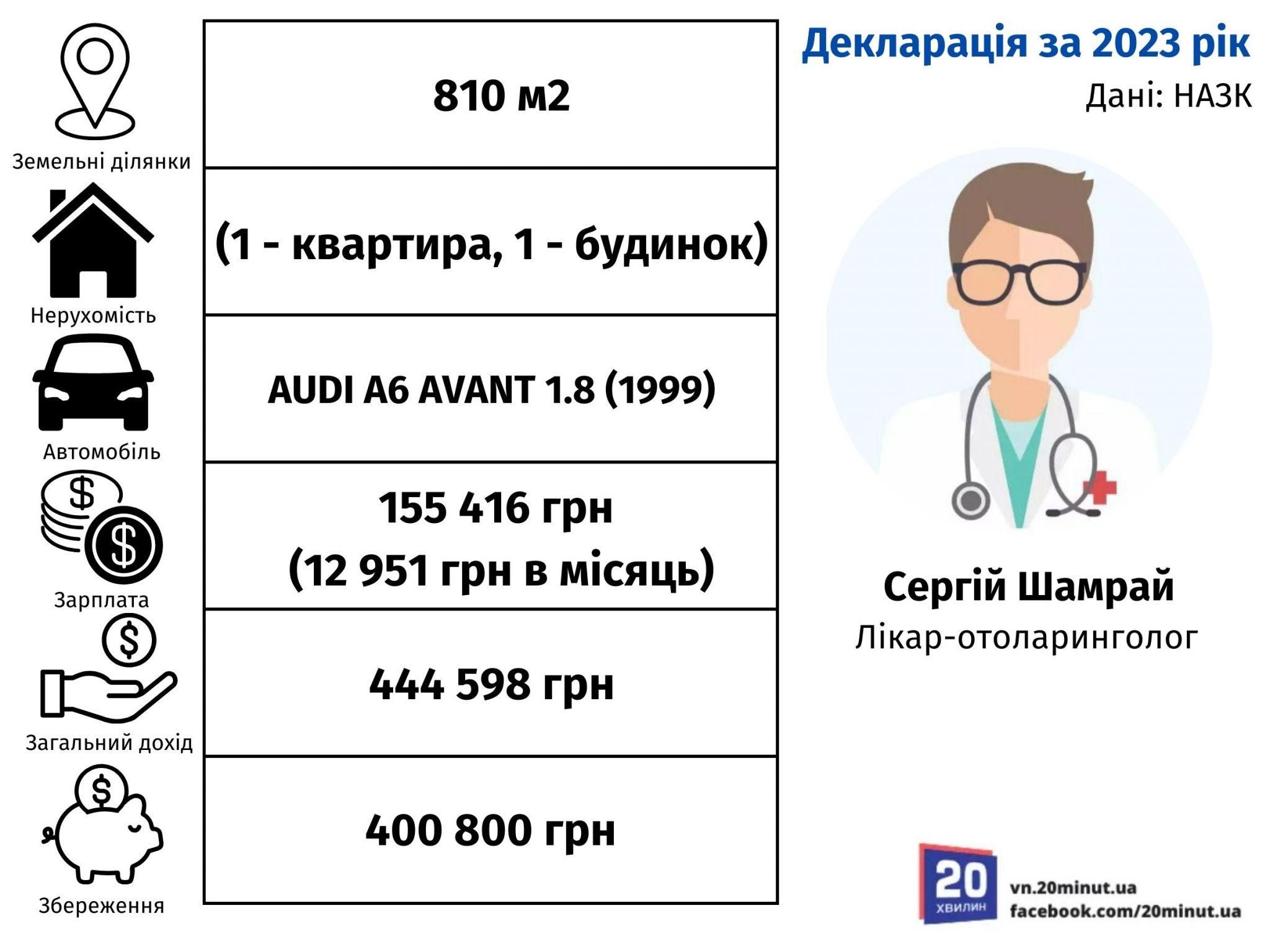 Лікарем-отоларингологом є Сергій Шамрай. У нього є 810 м² земельної ділянки, одна квартира та один приватний будинок. Їх площа не вказана.