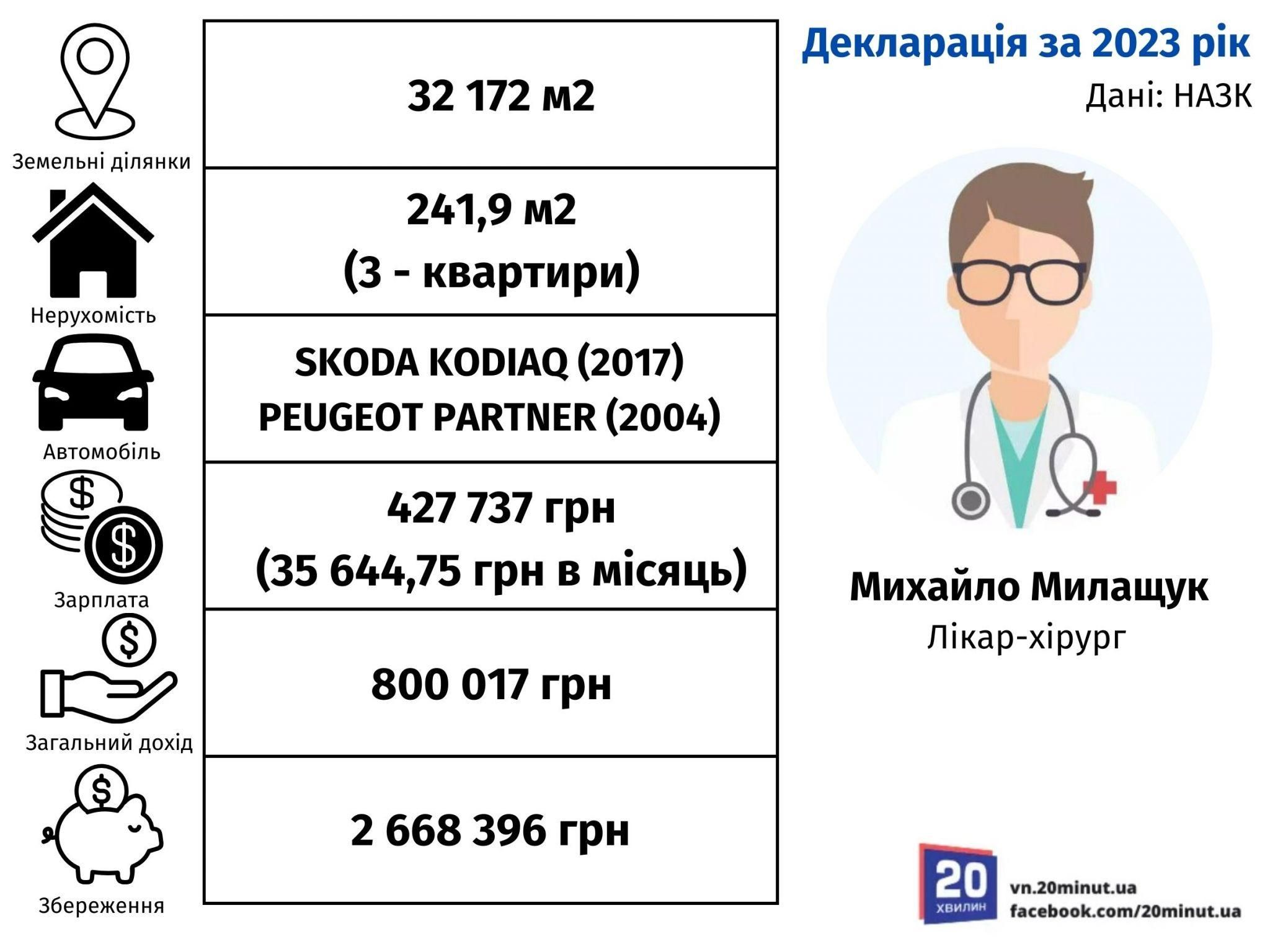 Лікарем-хірургом є Михайло Милащук. У нього разом з дружиною є 32 172 м² землі та 241,9 м² нерухомості: три квартири та один гараж.