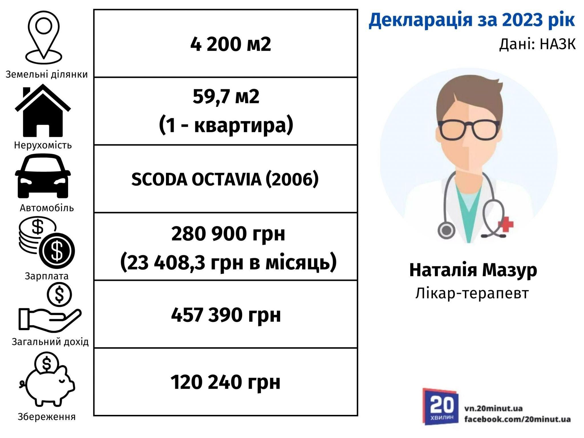 Лікарем-терапевтом у військово-лікарській комісії (ВЛК) є Наталія Мазур. Разом з чоловіком та дітьми у неї є 4 200 м² землі та одна квартира, площею 59,7 м².